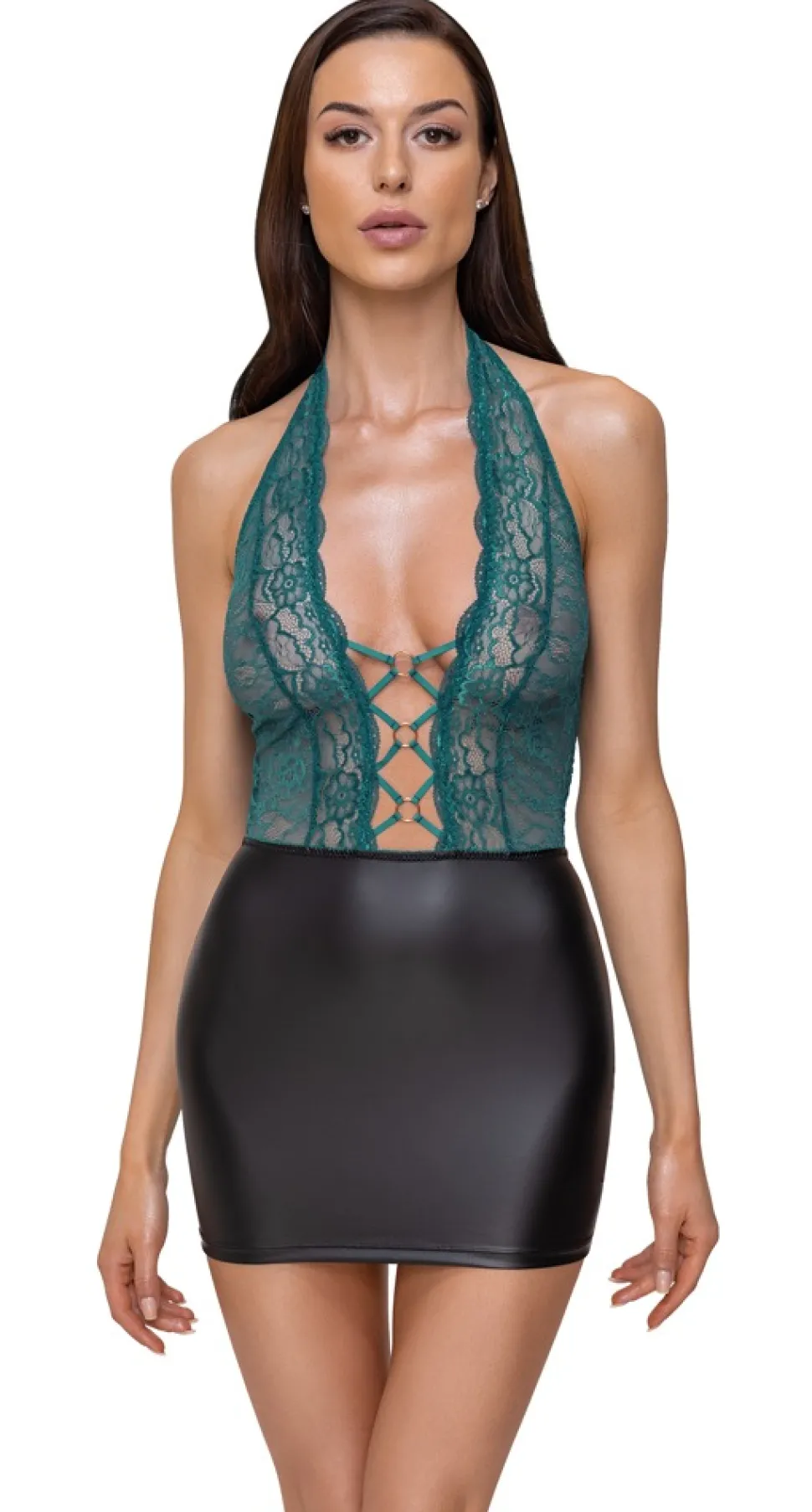 Eng geschnittenes kurzes Kleid von Cottelli LINGERIE in Zweiteiler-Optik mit Oberteil aus feiner petrolfarbener Spitze und Rockteil im edlen schwarzen Mattlook. Bis zum Bauchnabel tief dekolletiert – 3 rosé-goldfarbene Ringe und Stretchbänder halten alles schön zusammen. Rückenfrei, der Neckholder hat einen Clipverschluss.