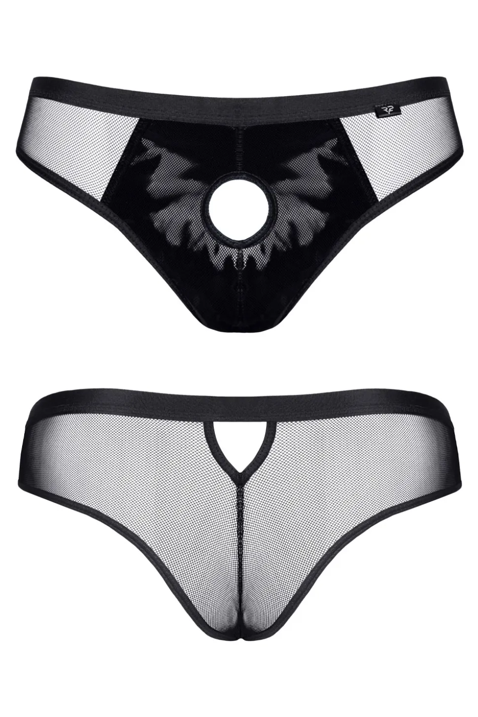 Brasilianischer Slip. Komplett aus elastischem und dehnbarem Tüll in Schwarz. An der Taille befindet sich ein schwarzes, breites und angenehm anzufassendes Gummiband. Vorne unter dem Tüll ein Einsatz aus schwarz glänzendem Vinyl. Interessant und ideal zum Spielen ist das Loch vorne, das mit einem Gummiband eingefasst ist. Das elastische Band, mit dem es eingefasst ist, erfüllt seine Kompressionsaufgabe perfekt.