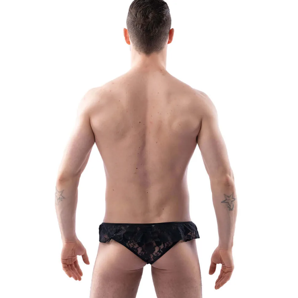 Zärtlich und filigran Ein edler Thong aus zarter, transparenter Spitze mit gerafftem Saum in schwarz.