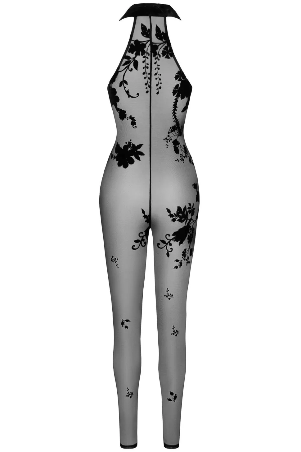 Edler Neckholder-Overall aus Netzstoff mit Wildblumenbeflockung. Mit Reißverschluss und einem gewagten, offenen Schulterdesign. Der Reißverschluss lässt sich individuell öffnen, um einen Cut-Out-Effekt zu erzeugen.
