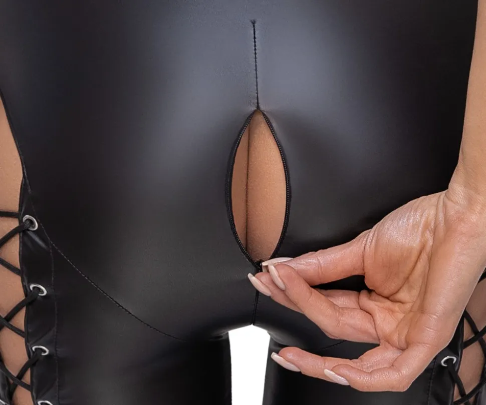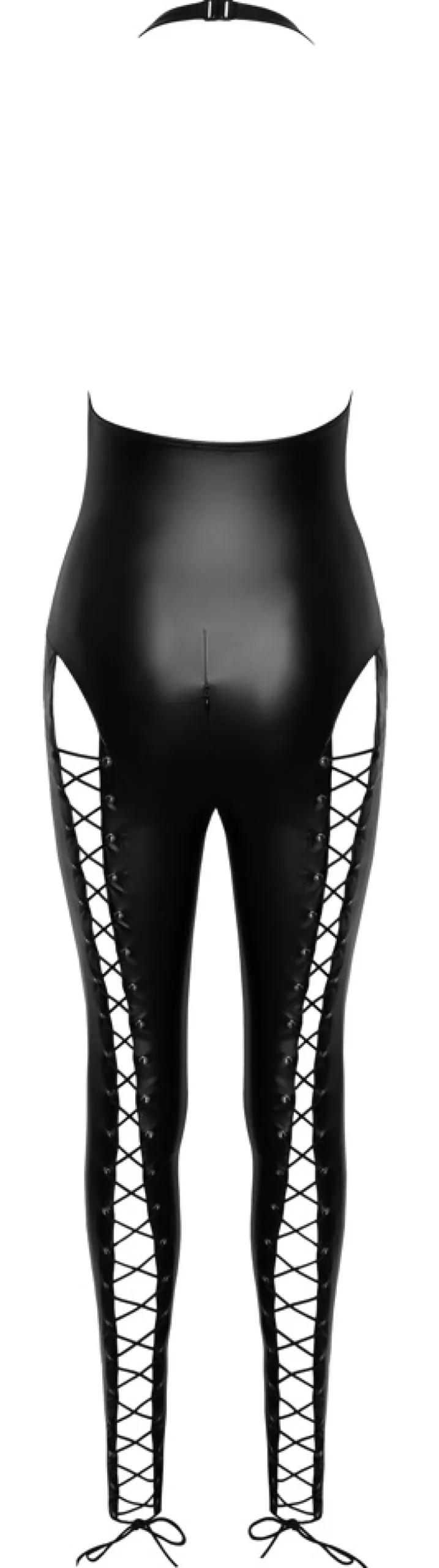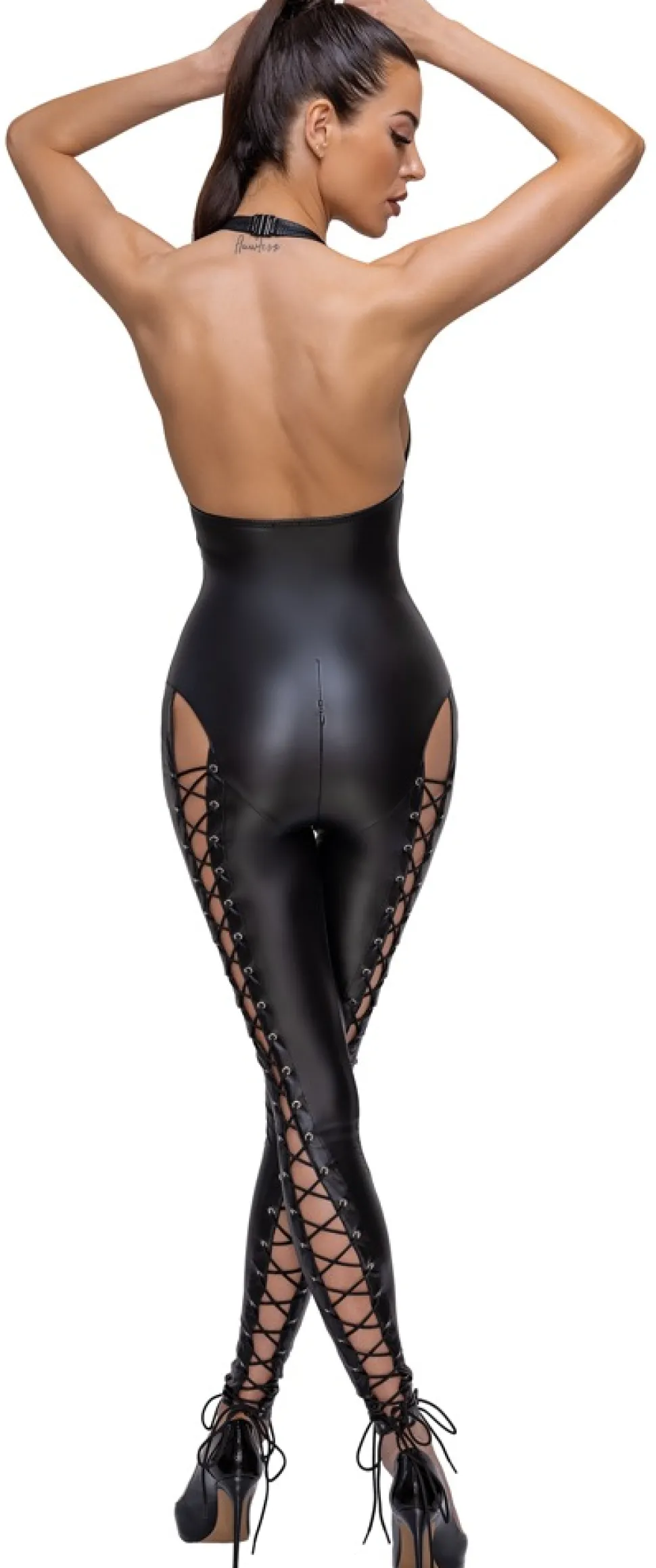 Rundum elastischer Overall im schwarzen Mattlook. In hautnaher Schnittführung mit langem engen Bein, das vorne und hinten sowie von oben bis unten mit einer Schnürung versehen ist. Im Schritt mit praktischem 2-Wege-Reißverschluss. Der Neckholder ist mit Clipverschluss.