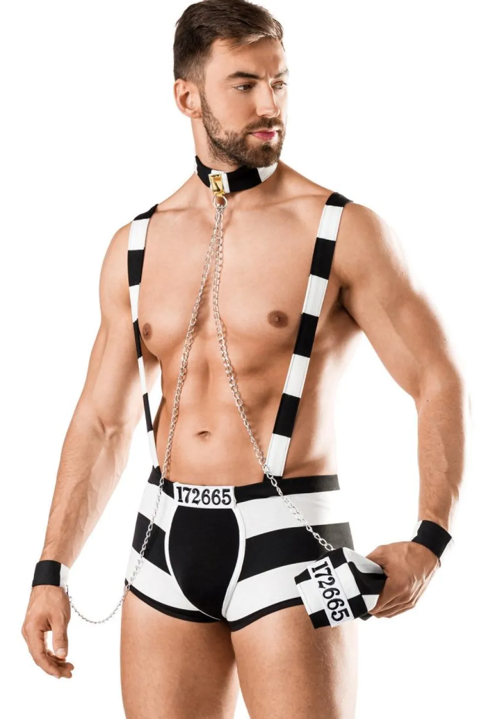 Sehr heißes Sträflingskostüm für Männer. Es besteht aus einer elastischen Short mit Hosenträgern und aufgestickter Nummer am Hosenbund. Zusätzlich im Lieferumfang enthalten ist ein Kragen und Manschetten, die beide mit Klettverschluss versehen sind. Die dazugehörige Kette ist an einem abnehmbaren Karabinerhaken befestigt. Die Mütze ist selbstverständlich ebenfalls inklusive.