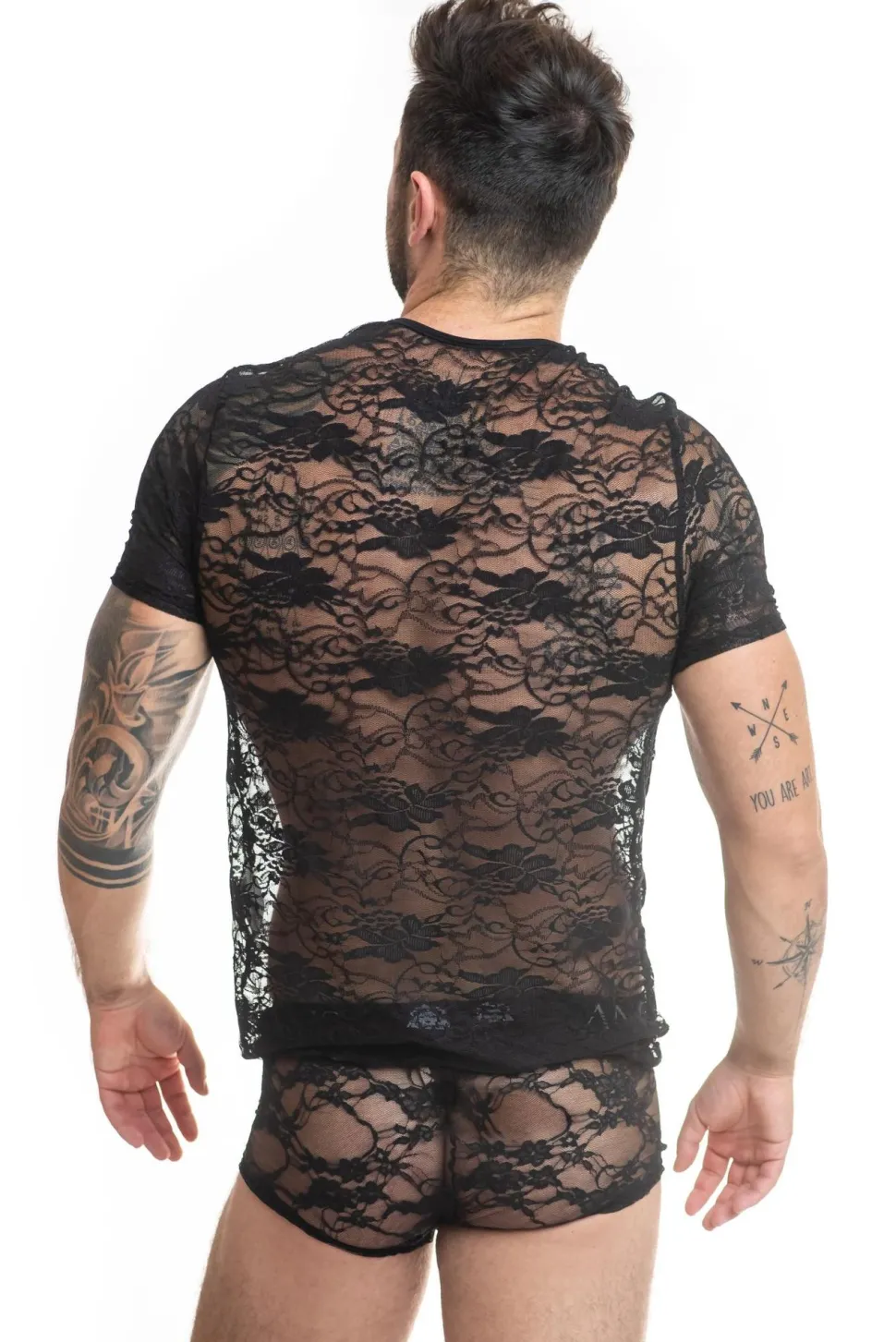 Herren T-Shirt, gefertigt aus transparentem, dehnbarer Spitze, mit schwarzen Saum am Hals.
