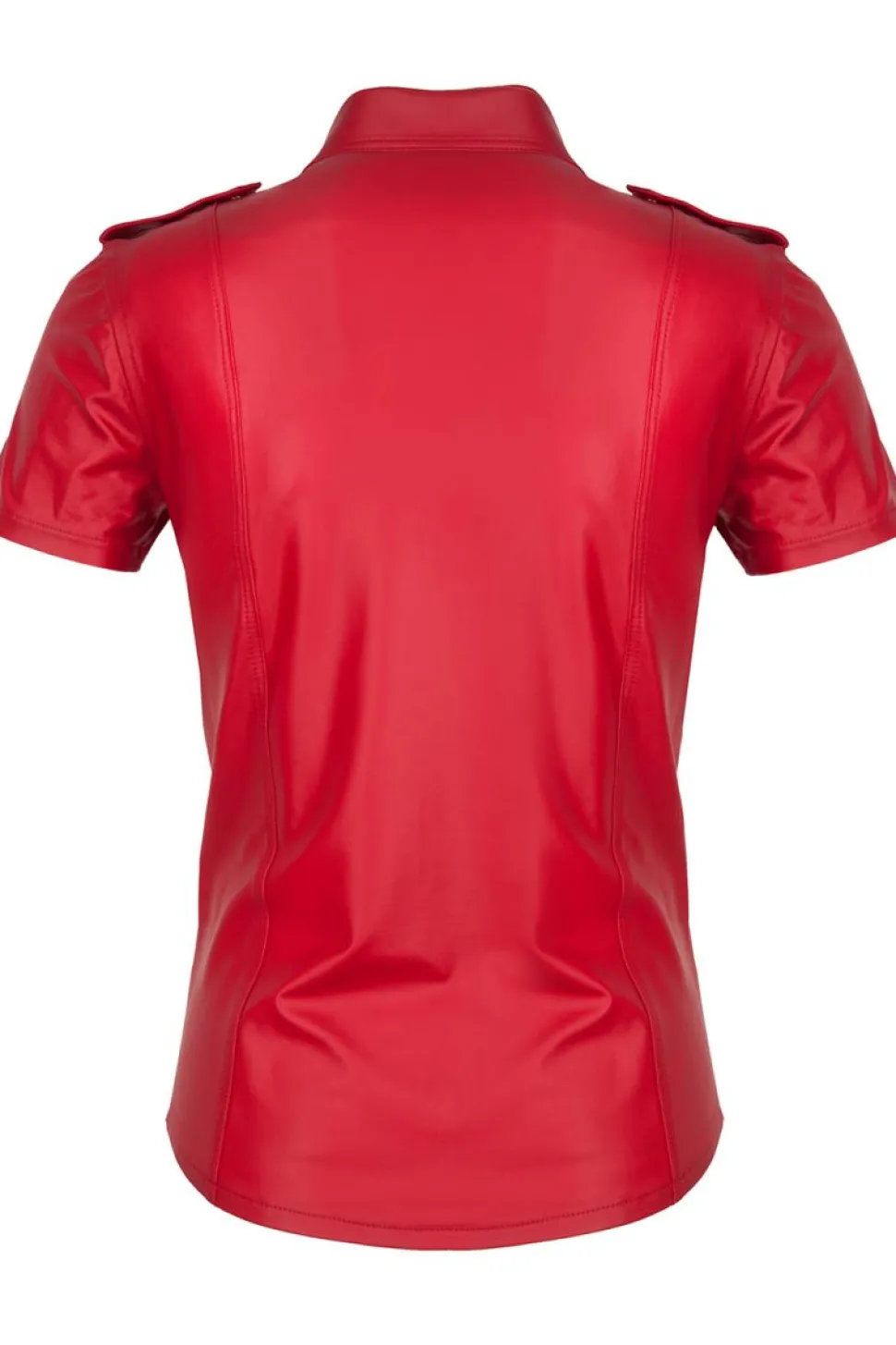 Ein wunderschönes, klassisches Hemd im Military-Schnitt. Lange vertikale Steppnähte vorn und hinten. Das Shirt hat einen Slim-Fit-Schnitt, der die Figur in der Taille optisch verschmälert und die Brust breiter wirken lässt. Schön sind auch die dekorativen Druckknöpfe an den Taschen, Schulterklappen und vorne über die gesamte Länge. Shirt aus rotem, elastischem Wetlook-Masterial, das sich angenehm anfühlt und sich schön der Figur anpasst.