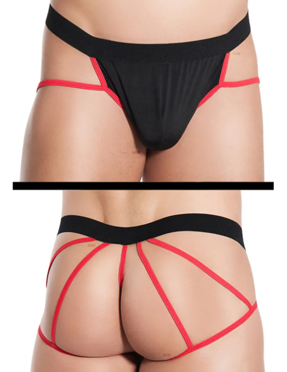 – Herren-Slip aus schwarzem Stoff, breitem Gummibund und roten Gummibändern