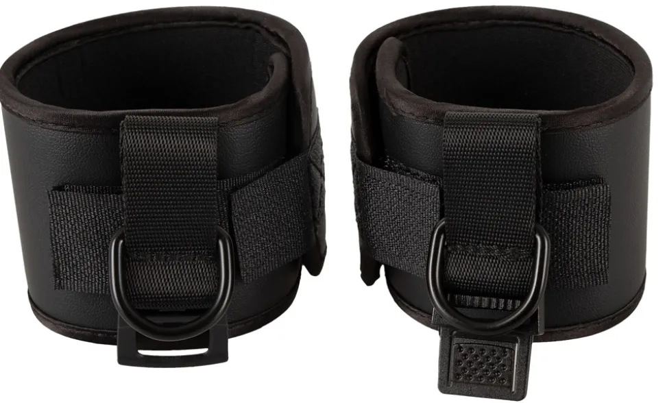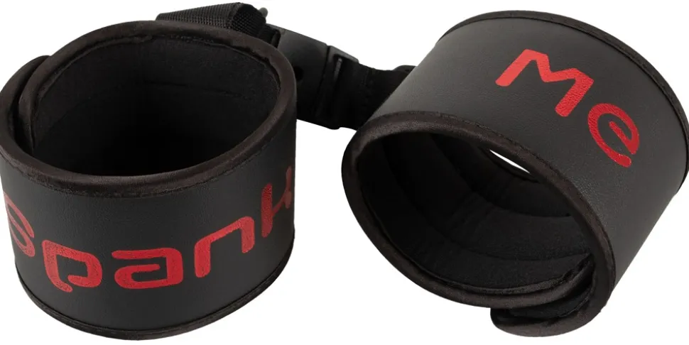 Softe Handfesseln Spank me-Cuffs von Bad Kitty verbunden durch kurzes Webband mit praktischem Clipverschluss. In Schwarz mit rotem Spank me-Schriftzug. Fesselmanschetten mit Klettverschluss im Umfang verstellbar, sowie schnell an- und abgelegt.