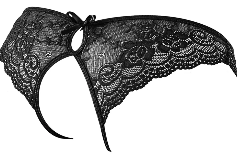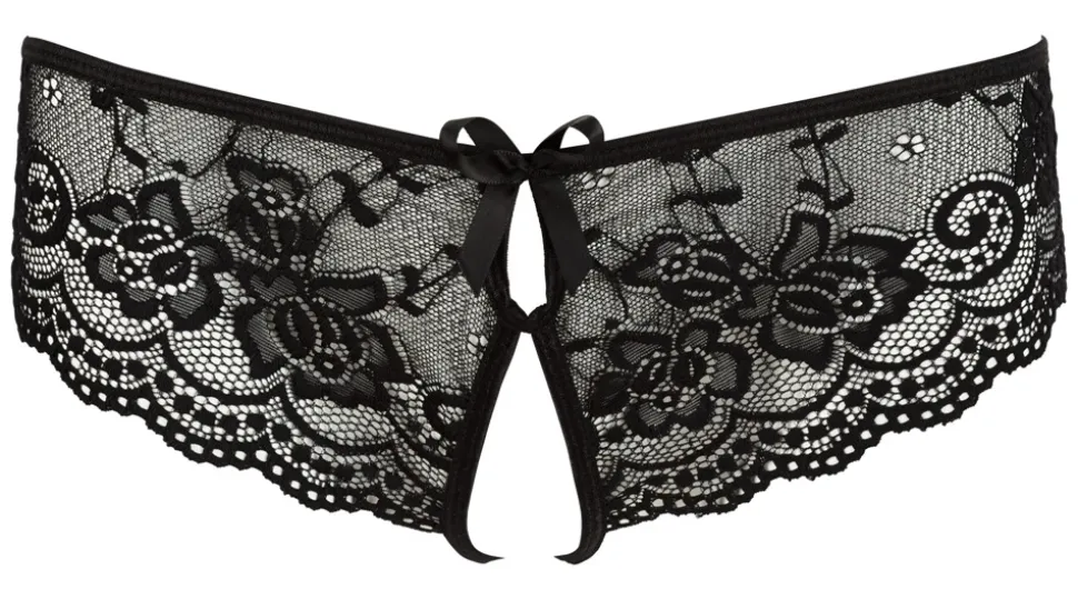 Dieser süße Slip kombiniert edle Blütenspitze mit schleifenverzierten Cut-Outs auf der Vorder- und Rückseite. Der Schritt wird lediglich durch 2 elastische Bänder gehalten und gewährt hocherotische Einblicke. Durch seinen hohen Elasthan-Anteil ist der Slip angenehm bequem und passt sich perfekt den weiblichen Rundungen an.