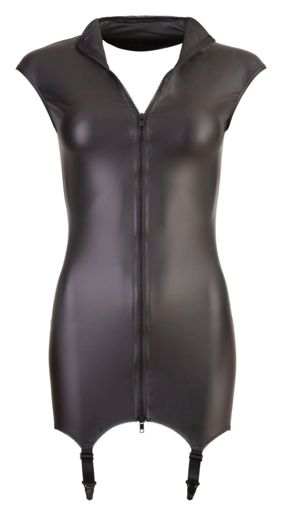 Genießen Sie erotische Augenblicke, wenn Sie dieses Straps-Kleid tragen. Das hochgeschlossene und ärmellose Minikleid aus mattglänzendem Stoff überzeugt mit seinem Zwei-Wege-Reißverschluss vorne und den vier angenähten Strapshaltern. Schwarz. 90% Polyester, 10% Elasthan.