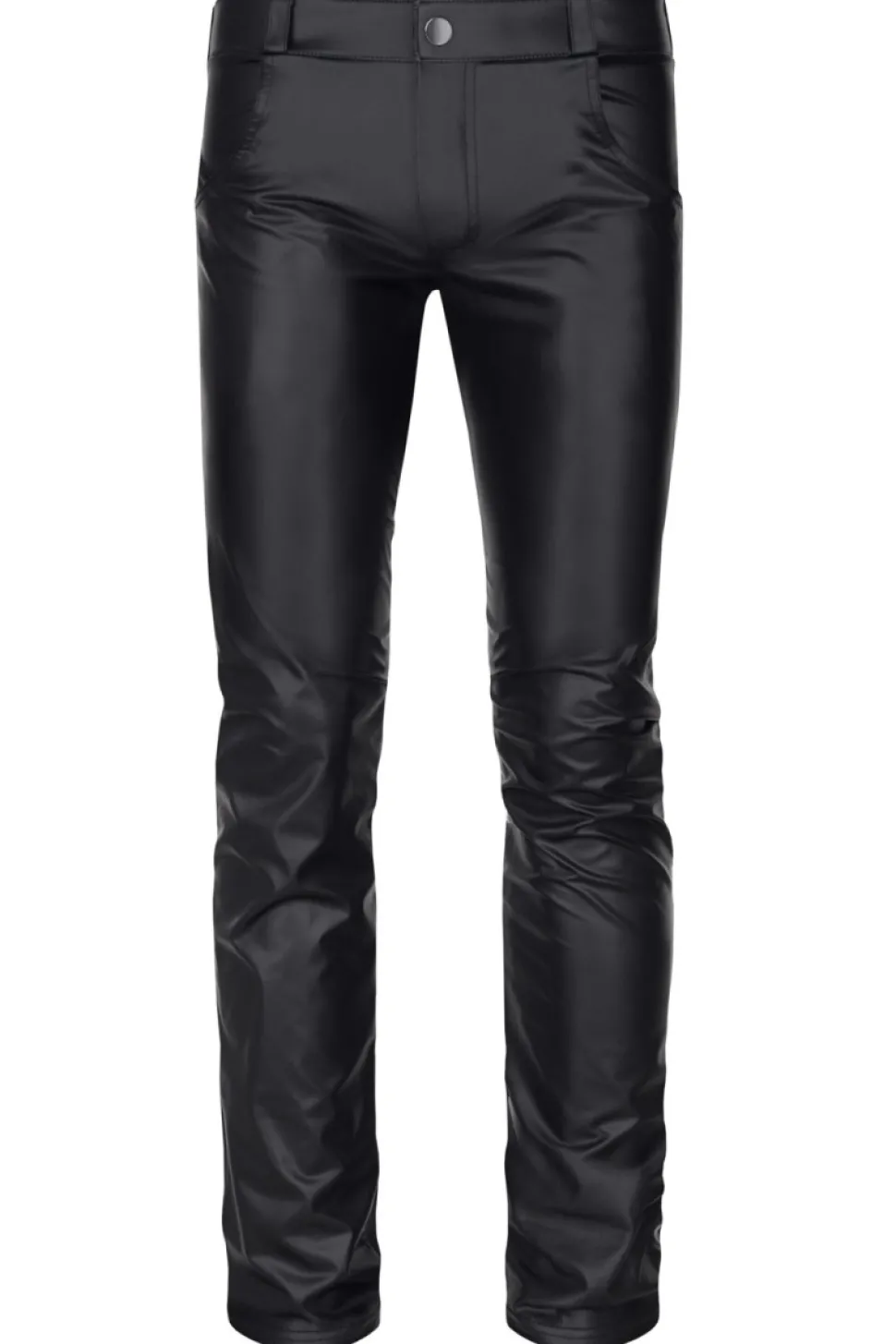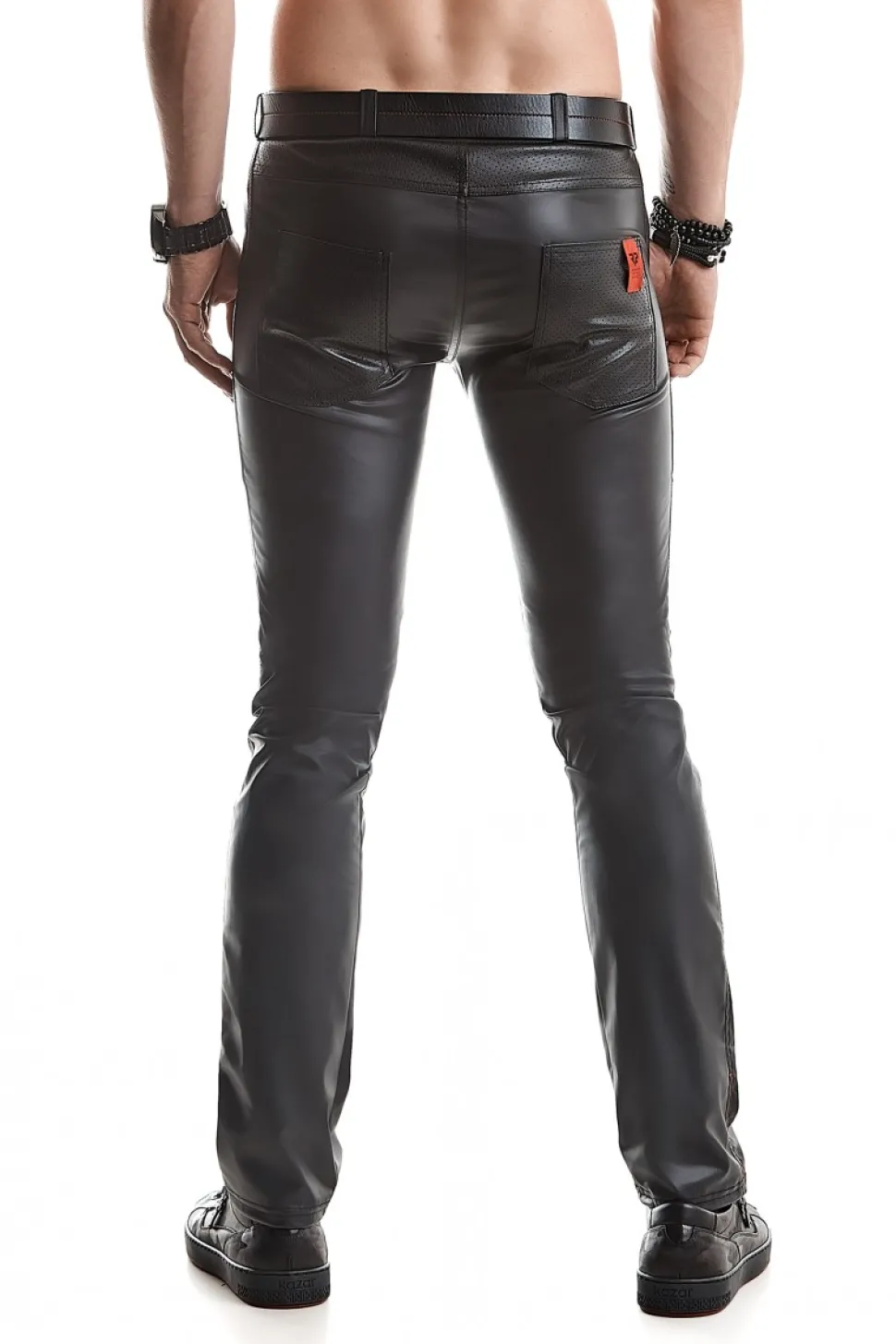 Edle Hose mit niedriger Taille aus dehnbarem, schwarzem Wetlook-Stoff. Die abgesenkte Taille, verleiht eine schmalere Hüftlinie – betont somit die sinnlich Form des Gesäßes. Die Taschen auf der Rückseite sind aus Wetlook mit Perforationen. Perfekt für den Club!