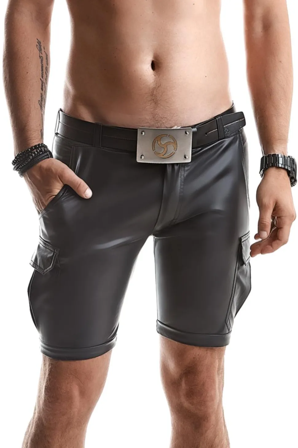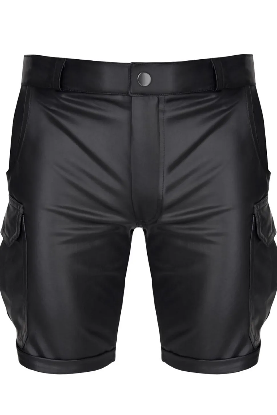 Aufregende Cargo-Shorts aus schwarzem, elastischem Wetlook mit abgesenkter Taille. An Hüfte und Beinen ist sie etwas lockerer geschnitten. Sie hat 6 funktionelle Taschen. Zwei Taschen vorne, 2 hinten und 2 an den Oberschenkeln. Dank dessen ist es kein Problem,Telefon, Brieftasche und andere kleine Gegenstände zu verstauen. Die Hose hat Gürtelschlaufen zum Tragen eines Gürtels. Das charakteristische rote Alcantara-Etikett mit RFP-Logo und punktroter Naht – wird jeden begeistern, der raffinierte und einzigartige Details schätzt.