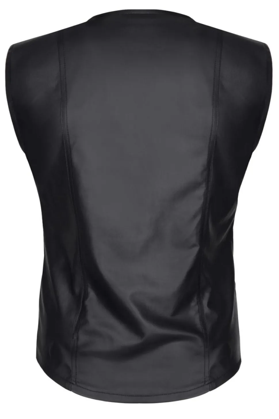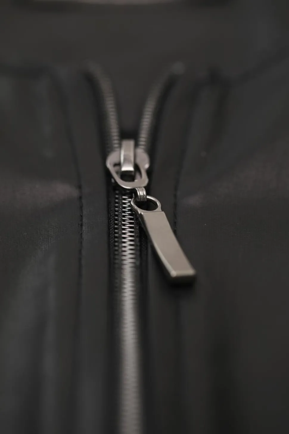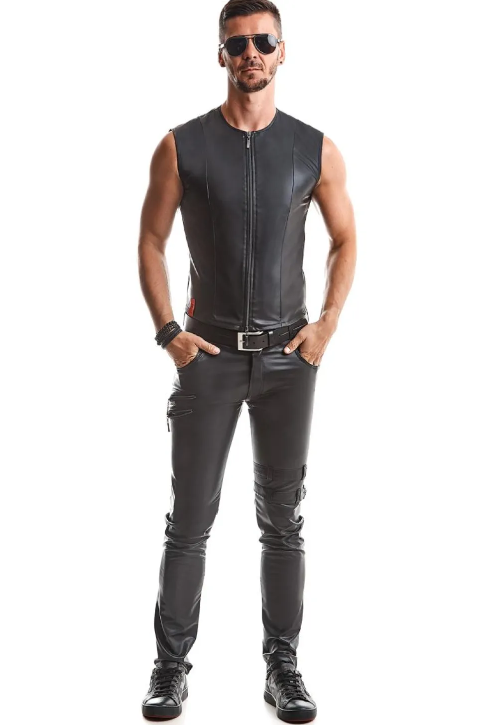 Moderne Weste aus schwarzem, elastischem Wetlook. Auf der Vorderseite befindet sich ein dunkler Reißverschluss, der von beiden Seiten – oben und unten – abnehmbar ist. Die Reißverschlüsse sind mit dem Logo von Regnes Fetish Planet graviert. Es gibt vertikale Stiche auf der Vorder- und Rückseite. Sie verleihen einen einzigartigen Look und verschmälern die Taille und verbreitern die Schultern und Brust optisch. Dieser Effekt lässt die Silhouette muskulöser erscheinen. Das charakteristische rote Alcantara-Label mit dem RFP-Logo und punktroten Nähten wird jeden begeistern, der raffinierte und einzigartige Details schätzt.