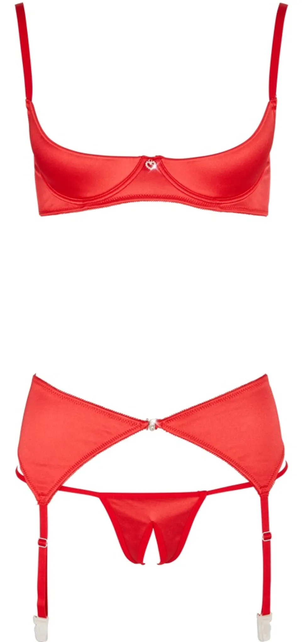 Rot wie die Liebe ist dieses 3-teilige Set, das aus Hebe, Strapshalter und String besteht. Die Hebe verfügt über stützende Bügel, gefütterte Cups und einen Hakenverschluss im Rücken. Die Träger sind verstellbar. Der Strapsgürtel hat einen Frontverschluss für leichtes Öffnen und vier verstellbare Strapshalter. Der passende String ist im Schritt einladend offen.