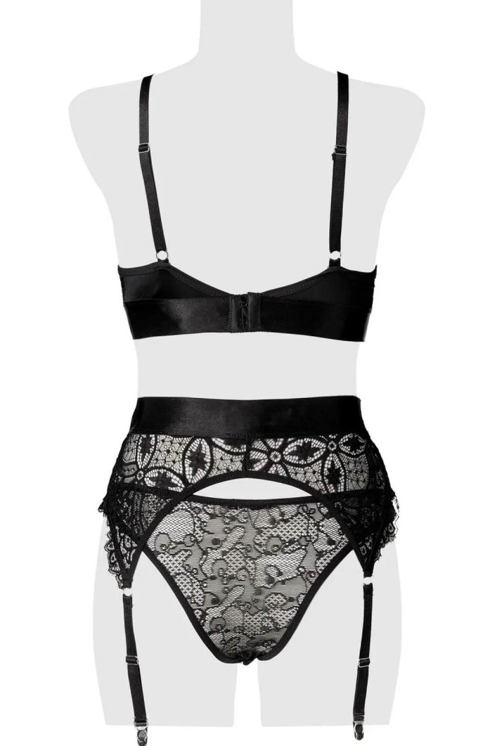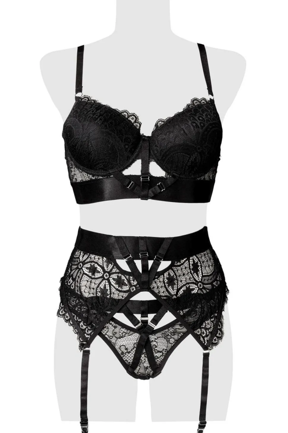 Schönes, detailreiches ,3- teiliges Straps-Set von Grey Velvet. Es besteh aus transparenter, elastischer Spitze mit floralem Muster. Ein leichter Push-up-BH sorgt für eine schöne Form, durch die verstellbaren Trägern, ist er individuell anpassbar. Mit Häckchenverschluss am Rückteil Der Strapsgürtel ist aus transparenter Spitze. Auch die Strapsbändern sind verstellbar