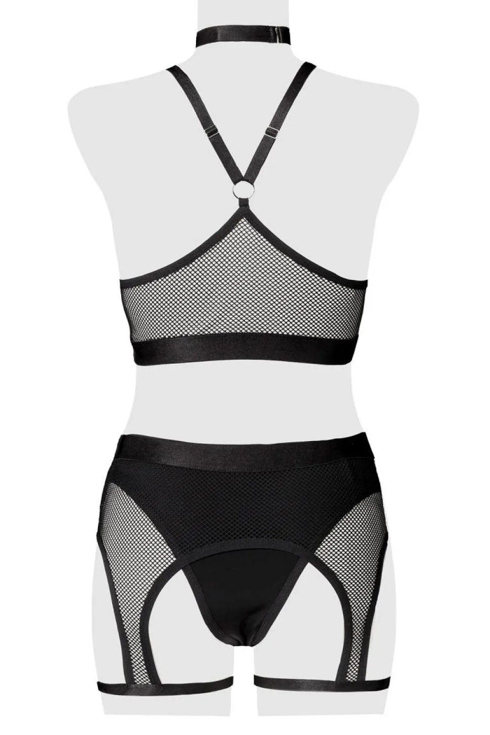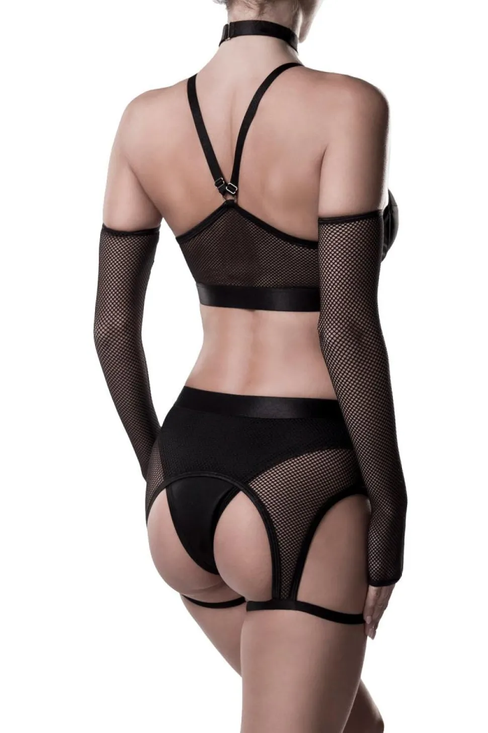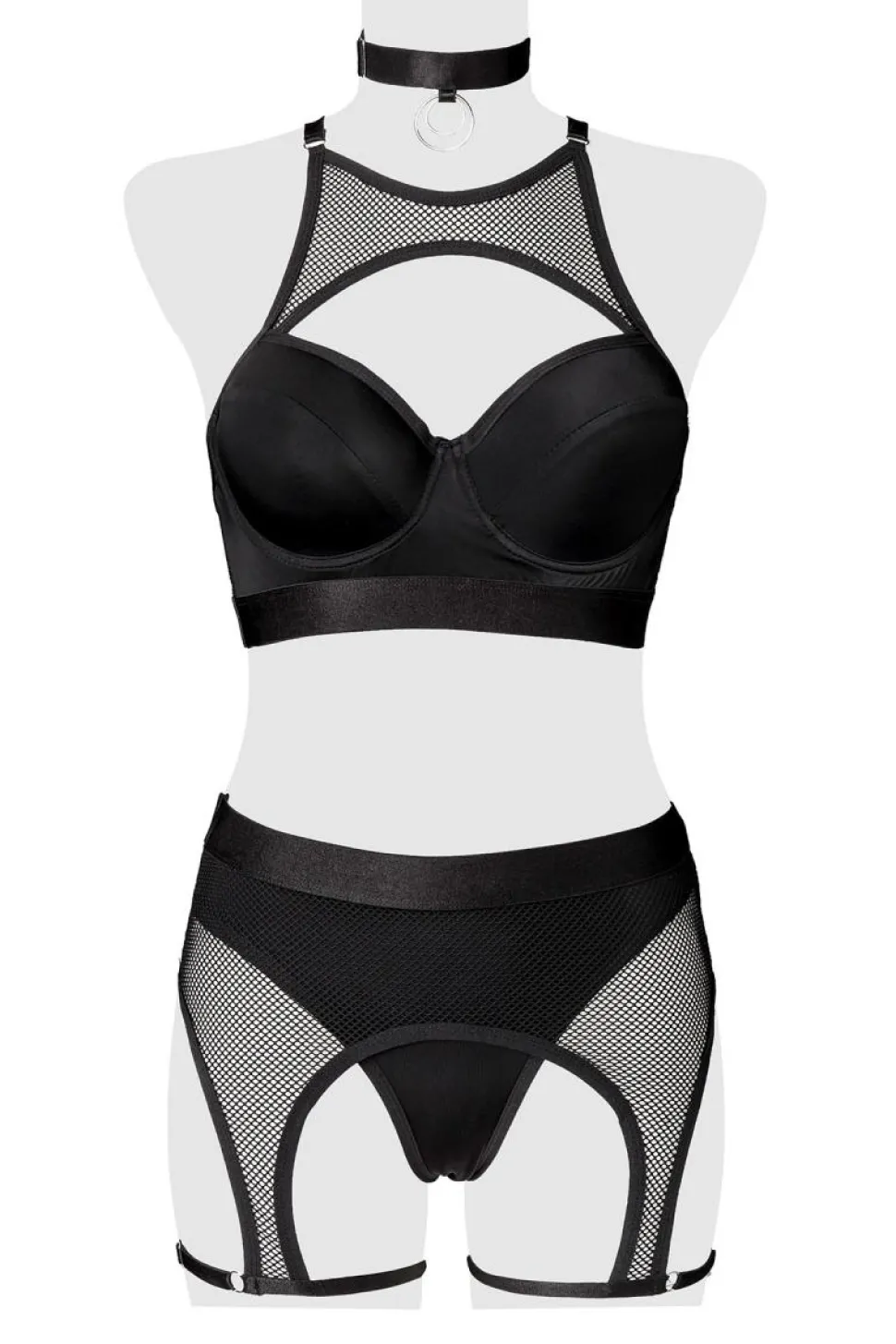 aufregendes Erotikset aus hochwertigen Materialen. der Bügel-BH ist an den Trägern verstellbar. Die Strumpfbänder sind ebenso verstellbar. Halsband ist mit dekorativen Ringen verziert. Die langen, fingerlosen Handschuhe sind mit dabei. 😛