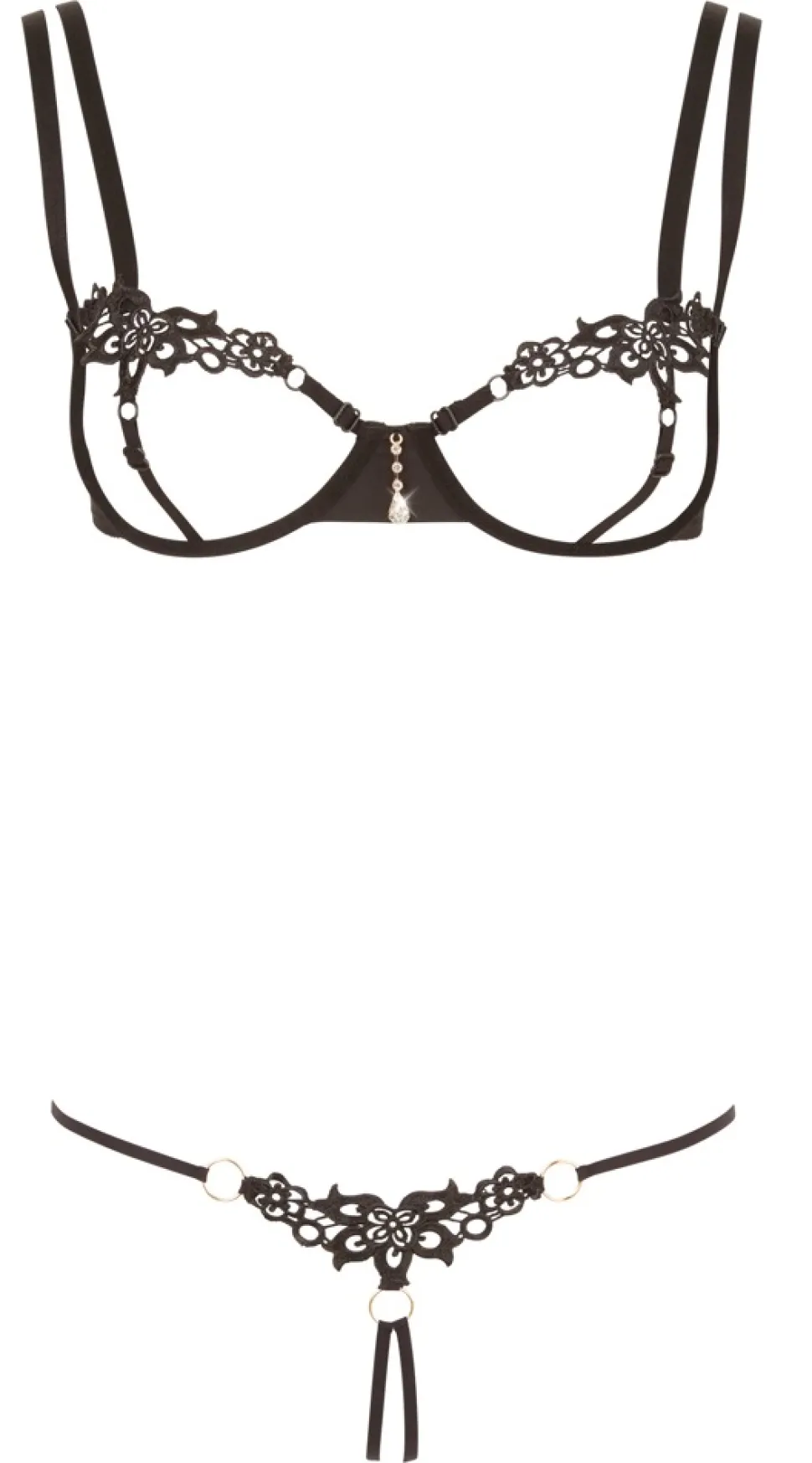 Der BH mit den offenen Cups besteht nur aus Bügeln und Bändern und lässt daher tief blicken, denn die Brustwarzen sind nur durch eine Stickerei bedeckt. Im Rücken verfügt der BH über einen Hakenverschluss und die Träger sind in der Länge verstellbar. Der passende String ist im Schritt einladend ouvert und verfügt ebenfalls über eine edle Stickerei in der Front, die über drei kleine silberfarbene Ringe mit den Bändern verbunden ist.