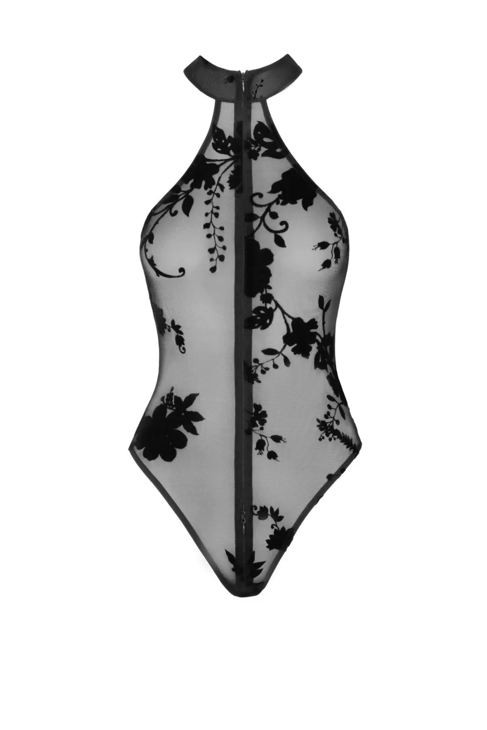 Edler Neckholder-Body aus Netzstoff mit Wildblumenbeflockung. Figurbetont mit offenen Schultern und einem versteckten 3-Wege-Reißverschluss.