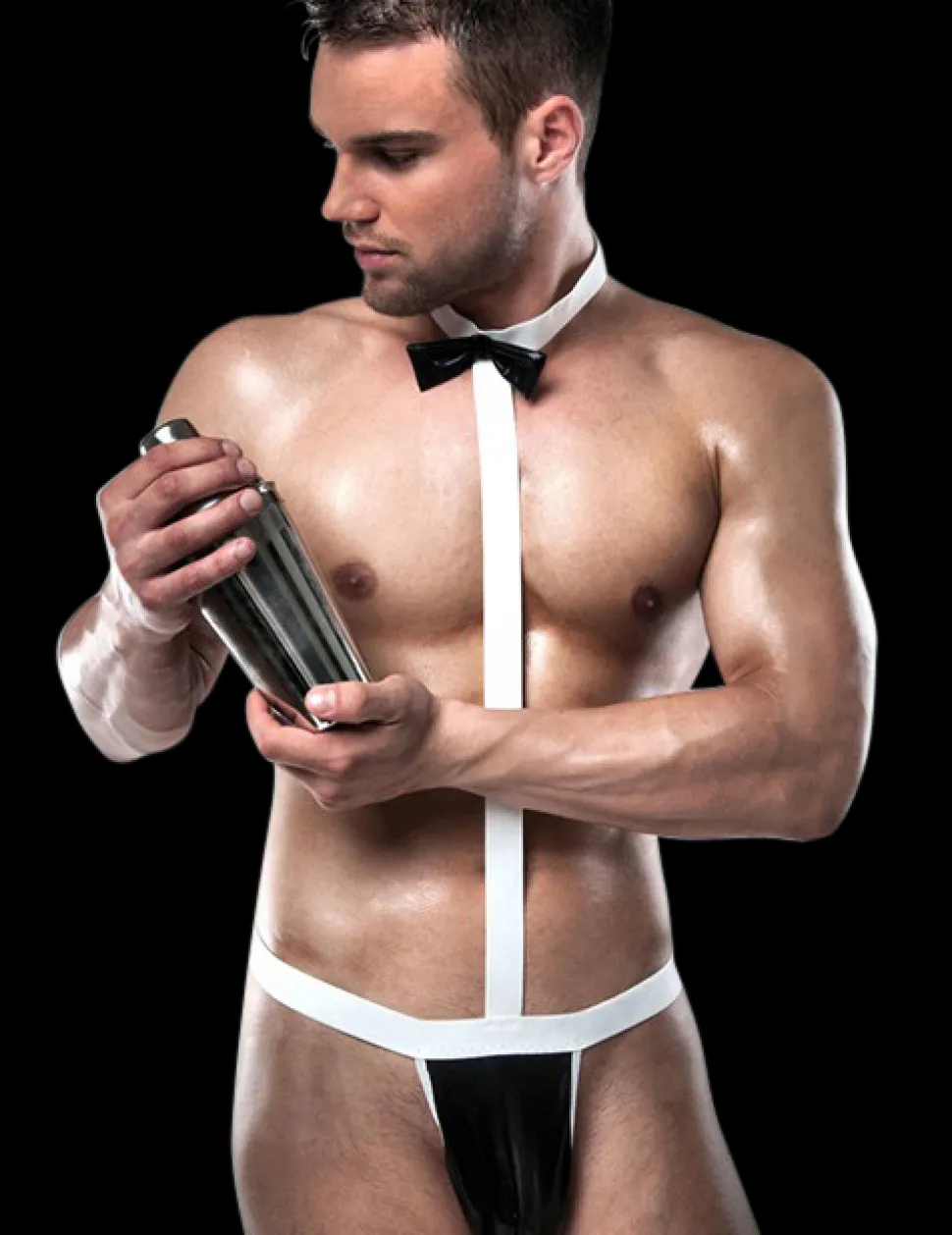 Barkeeper-Outfit für grenzenlosen Partyspaß. Noch einen Cocktail oder einen Long-Drink? Wenn dieser Barkeeper seinen Charme ausspielt, stehen die Testosterone Kopf. Der Body besteht softem, schwarzem Wetlook-Material und elastischen, weißen Bändern.
