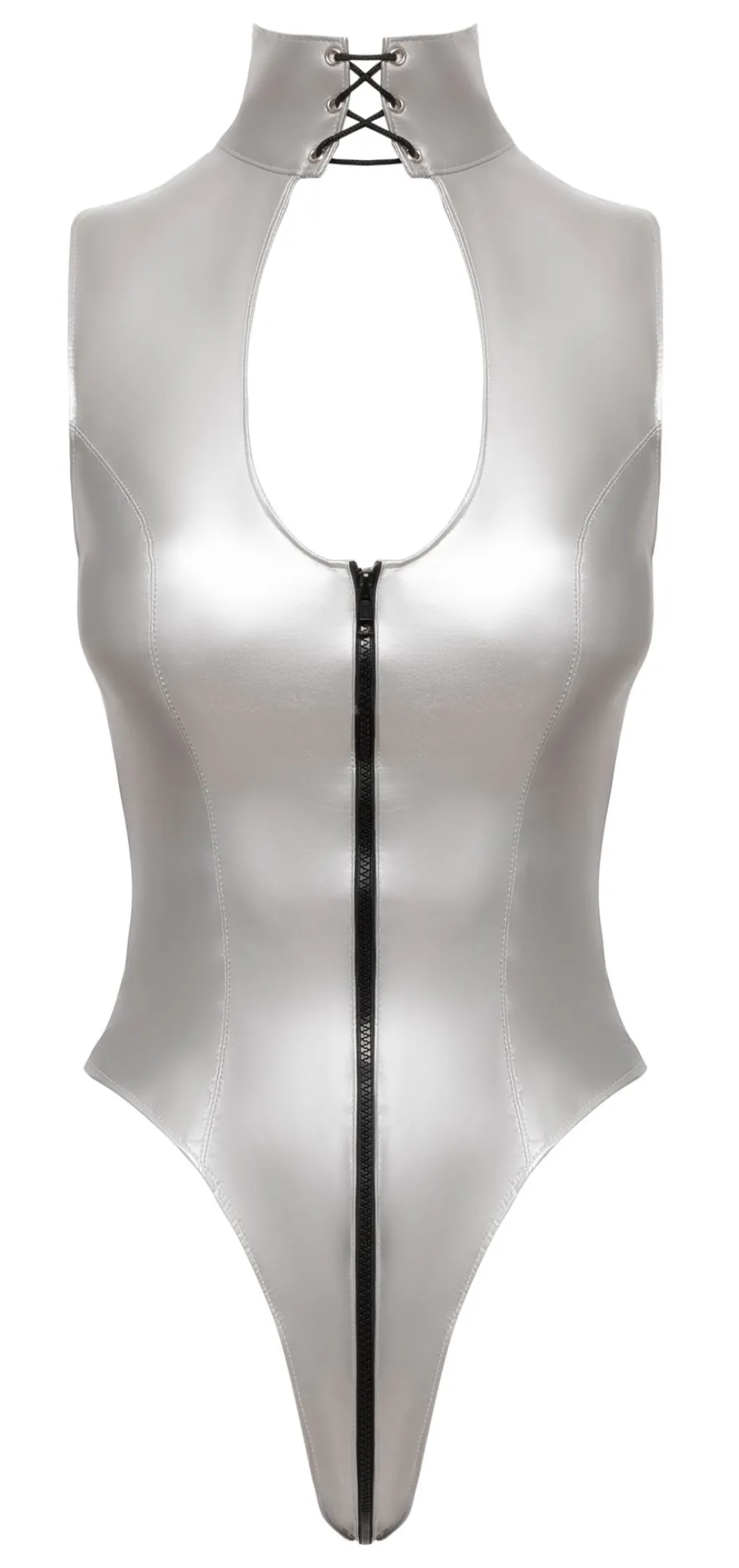 Eyecatcher-Einteiler im Silberglanz. Ärmelloser Body von Black Level komplett im silberfarbenen Lackglanz. In figurnaher Schnittführung mit hohen Beinausschnitten und extravagantem, hohem Kragen mit schwarzer Schnürung vorne. Der schwarze Reißverschluss verläuft vom Dekolleté durch den Schritt bis über den Po. Er lässt sich von beiden Seiten öffnen.