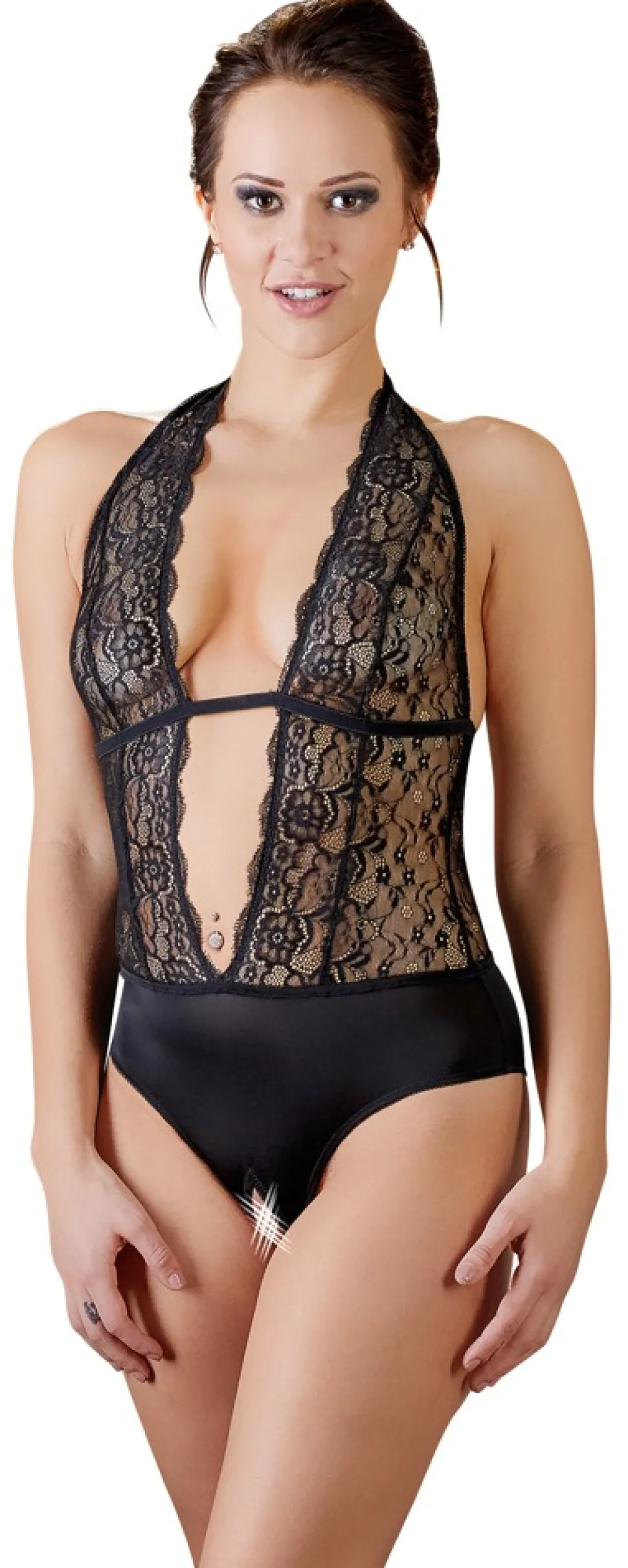 Dieser schwarze Neckholder-Body mit praktischem Clipverschluss im Rücken besticht mit Oberteil aus feiner Spitze und lockt mit offenem Schritt …