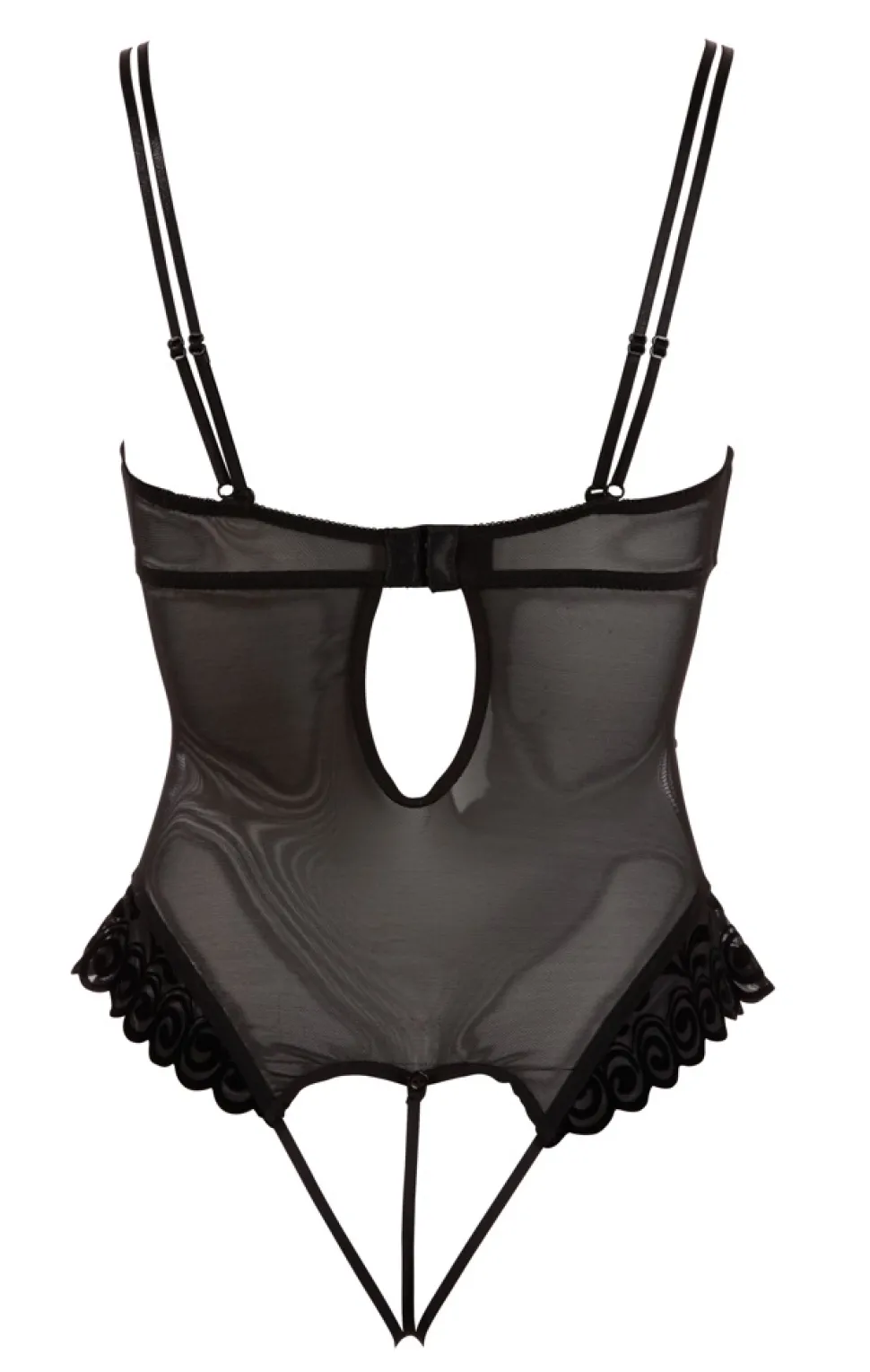 Dieser schwarze Stringbody aus Powernet hat es in sich, denn mit einem einzigen Ruck können Sie nackte Tatsachen schaffen! Nicht nur die Cups lassen sich nämlich samt Trägern von der leicht gepolsterten Bügel-Hebe abknöpfen und geben so den Blick auf Ihren Busen frei – perfekt für Ihre private Strip-Show! Auch der Stringteil am Body ist abknöpfbar und macht so den Weg zu Ihrem Intimsten frei. Mit Strass-Accessoire zwischen den Cups, Hakenverschluss im Rücken und verstellbaren Trägern. Flockprint an Cups und Beinausschnitt. 90 % Polyamid, 10 % Elasthan.