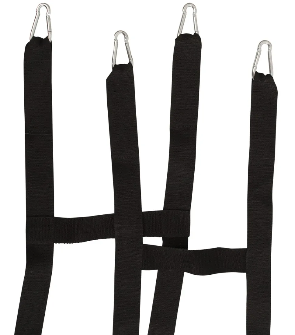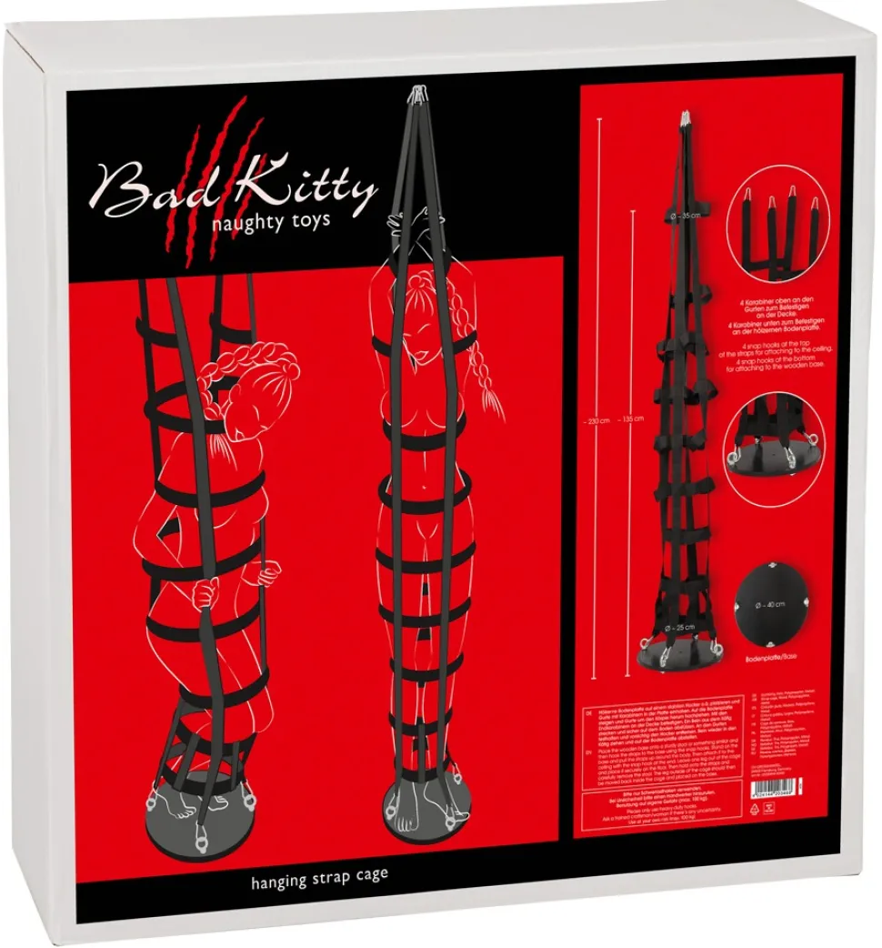 Der aufzuhängende Bondagekäfig hanging strap cage von Bad Kitty zwängt den Körper stramm und fest ein – es gibt kein Entkommen! Die Riemenkonstruktion aus reißfesten Textilgurten wird schnell und einfach mit ihren Karabinern an der robusten runden Stehplatte aus Holz eingehakt. Die 4 vertikalen Gurte sind oben ebenfalls mit stabilen Karabinern ausgestattet, die an einem Deckenhaken (nicht beiliegend) oder auch z. B. an einem Baum, Teppichstange o. ä. befestigt werden können.