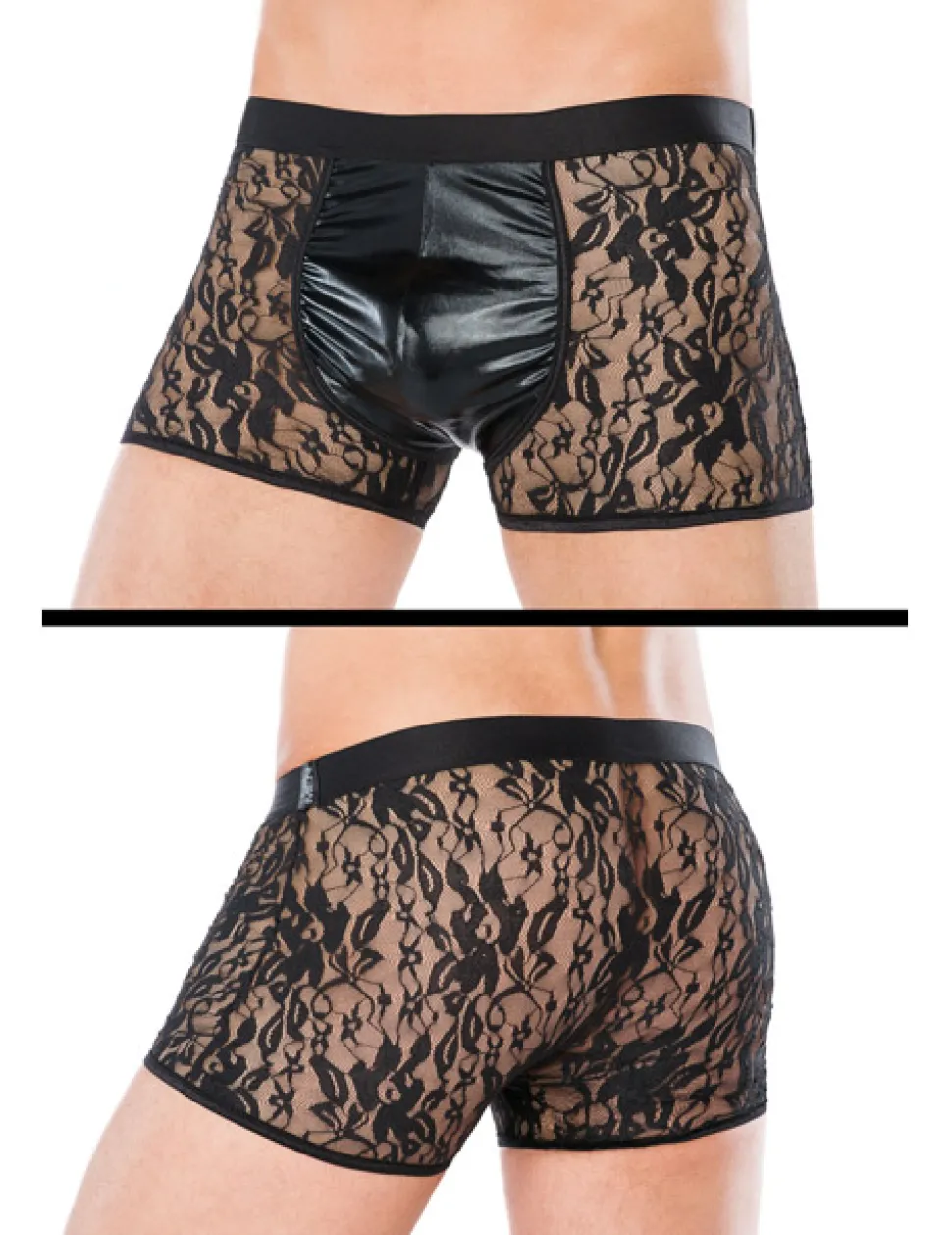 – Schwarze Herren-Shorts aus dehnbarem Material (Wetlook + Spitze)