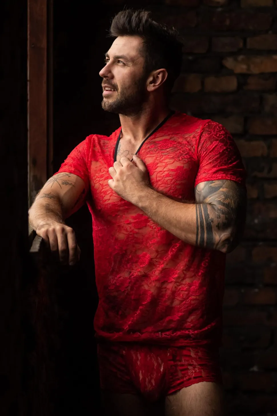 Herren T-Shirt, gefertigt aus transparentem, dehnbarer Spitze, mit schwarzen Saum am Hals. Perfekte Passform und hoher Tragekomfort.