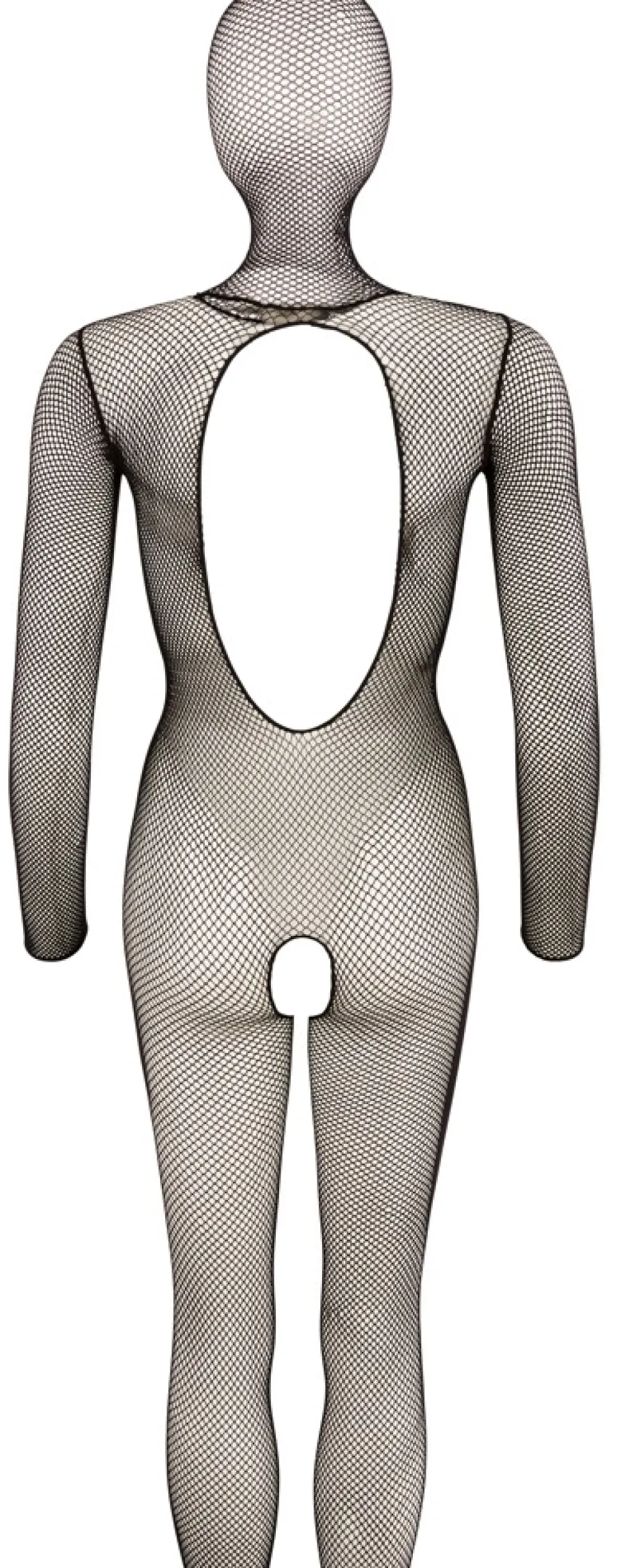 Hochelastischer Catsuit ouvert mit Kopfmaske ohne Augen- und Nasenlöcher. Lediglich der Mund bleibt frei. Aus feinem Netzmaterial, mit Fuß und rundem Ausschnitt im Rücken.