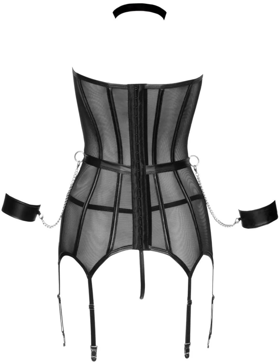 - Lieferumfang: Corsage, Halsband, String, Handfesseln, Schal