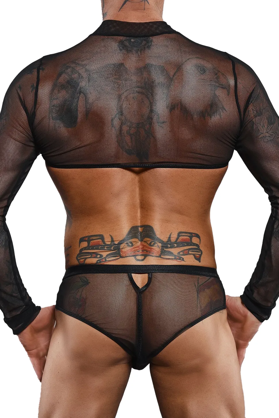 Crop-Top komplett aus dehnbarem und elastischem Tüll in Schwarz im Wetlook-Stil. Verbreitert effektiv die Schultern und die Brust und bringt den nackten Rücken und Oberkörper zum Vorschein. Am Umfang im unteren Teil und an den Ärmeln mit Gummiband abgeschlossen. Durch die elastischen Eigenschaften des Materials passt es sich perfekt an den Körper an.