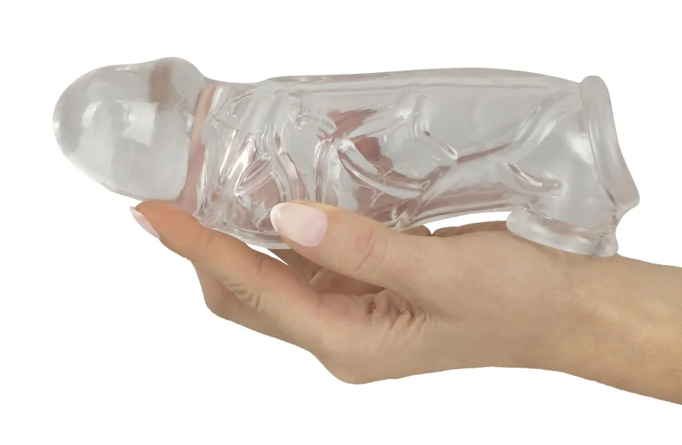 Verdickt und verlängert den Penis. Transparente, ausgeprägt geäderte Penishülle mit Hodenring. Die eng sitzende, erektionsunterstützende Hülle aus weichem Stretchmaterial wird einfach über das erigierte Glied gestreift. Der integrierte Hodenring sorgt für festen, angenehmen Sitz ohne Abrutschen.