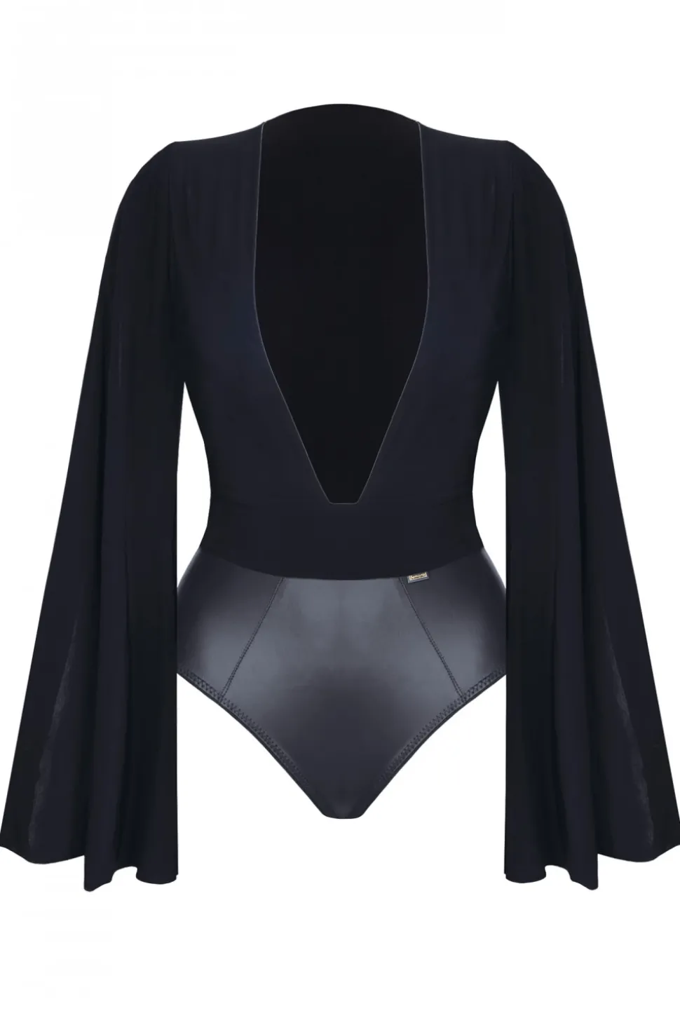 Eleganz, Stil und Energie, strahlt dieser einzigartiger Body mit langen Ärmeln, offenen Schultern und einem faszinierenden tiefen Ausschnitt aus. Er wurde aus 2 verschiedenen Stoffen hergestellt. Das Oberteil ist aus weichem, elegantem und angenehm anzufassendem schwarzem Strickstoff, dieser schmiegt sich wunderbar an den Körper an und fühlt sich angenehm an. Die Unterseite ist aus schwarzem, elastischem Wetlook. Auf der Rückseite wurden vertikale Nähte verwendet, die den Stoff leicht knittern. Ein Must-Have für weibliche Liebhaber stilvoller, aber auch sinnlicher Dessous.