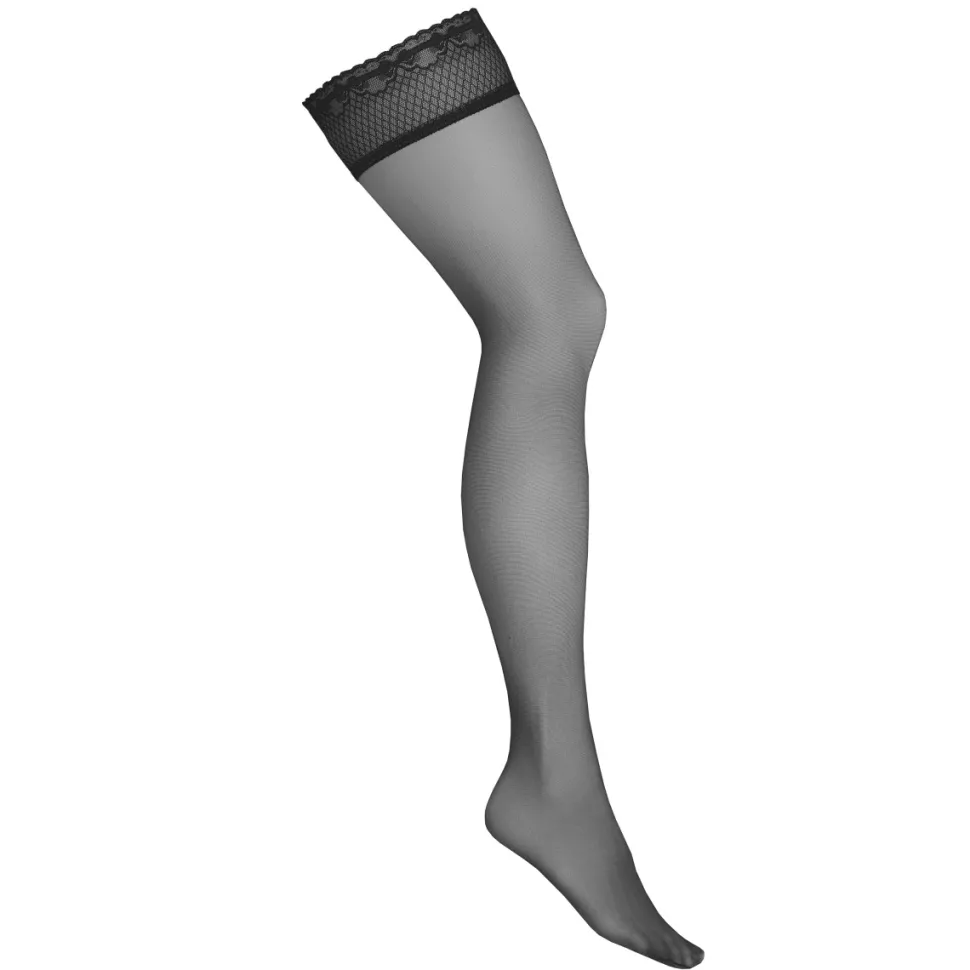 Elegante halterlose Feinstrümpfe gefertigt aus zarten Materialien. Obenrum mit einem eleganten Spitzenrand versehen, der die Beine super schön umrandet. Ein echter Hingucker für Deinen nächsten Auftritt.