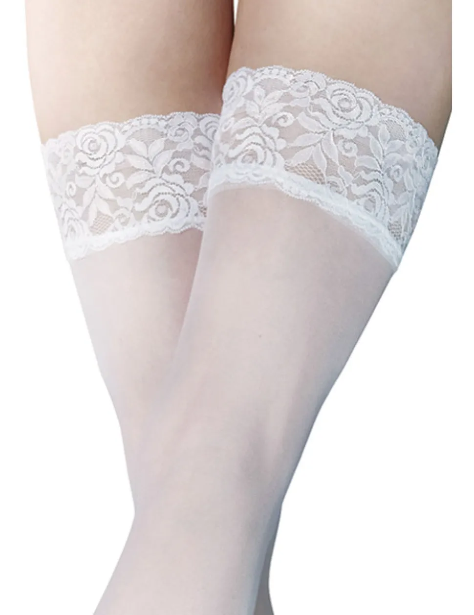 – Halterlose Strümpfe aus feinem Stoff und Spitzenabschluss