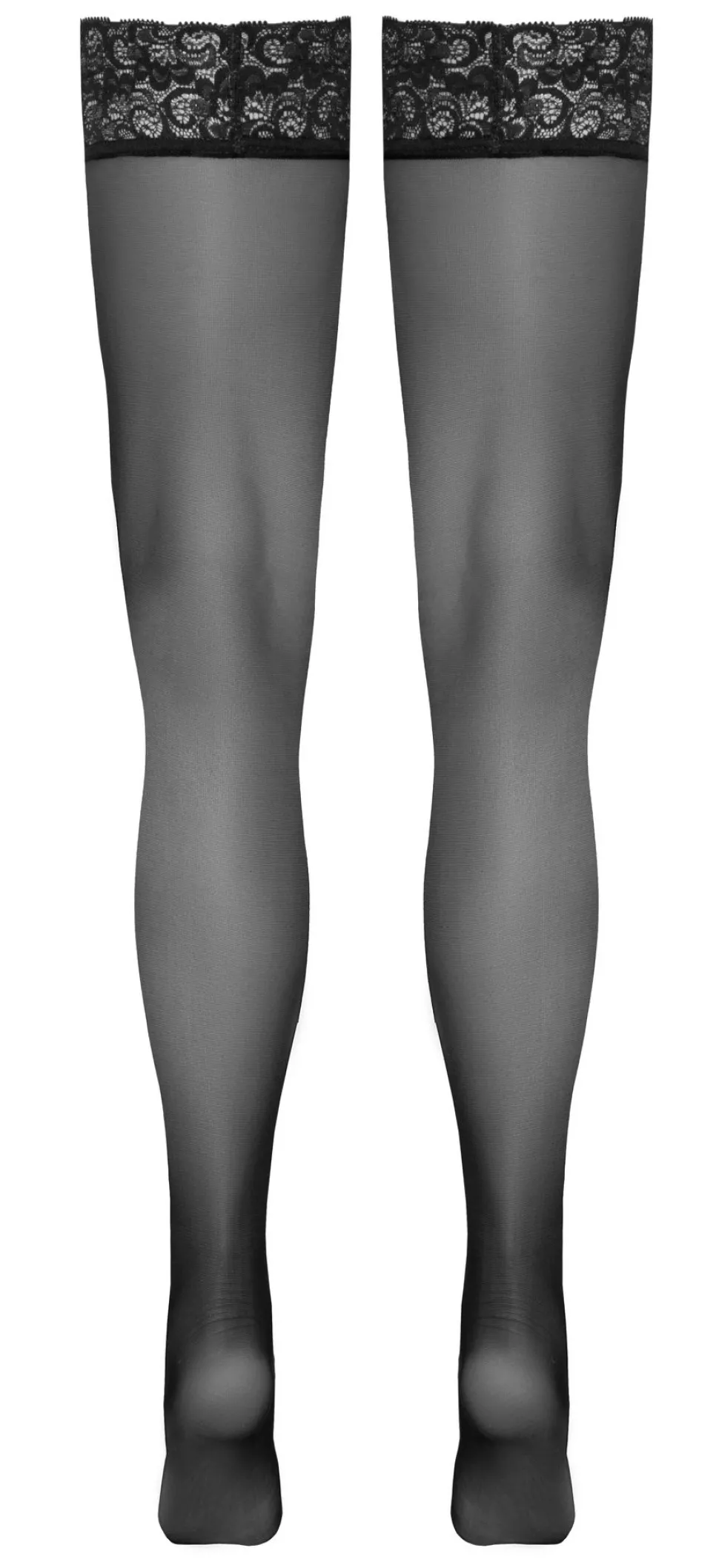 Halterlose schwarze Strümpfe von Cottelli LEGWARE mit schönem 6 cm breitem Spitzenabschluss. Innen mit Silikonverstärkung für rutschfesten Sitz und optimalen Halt.