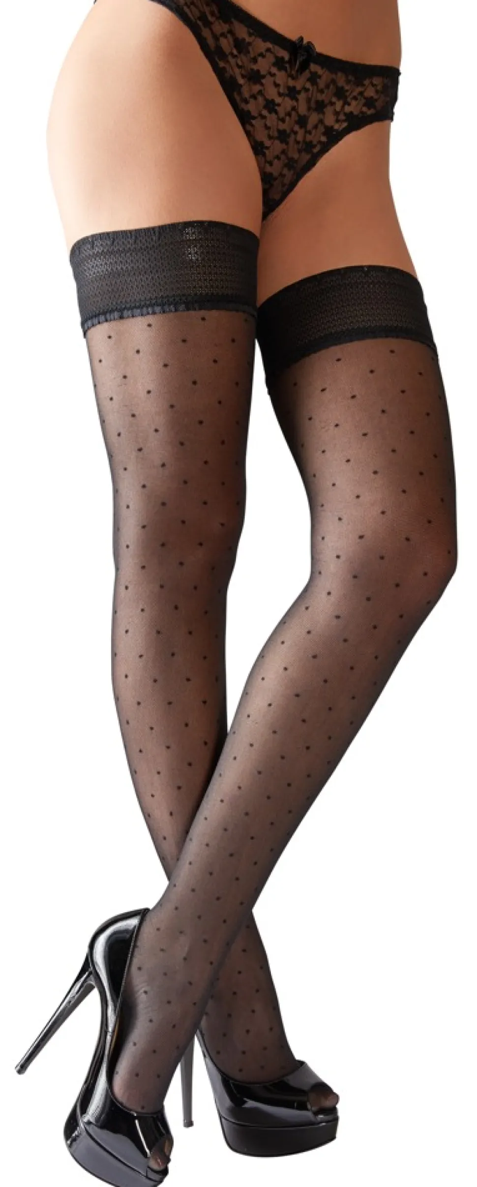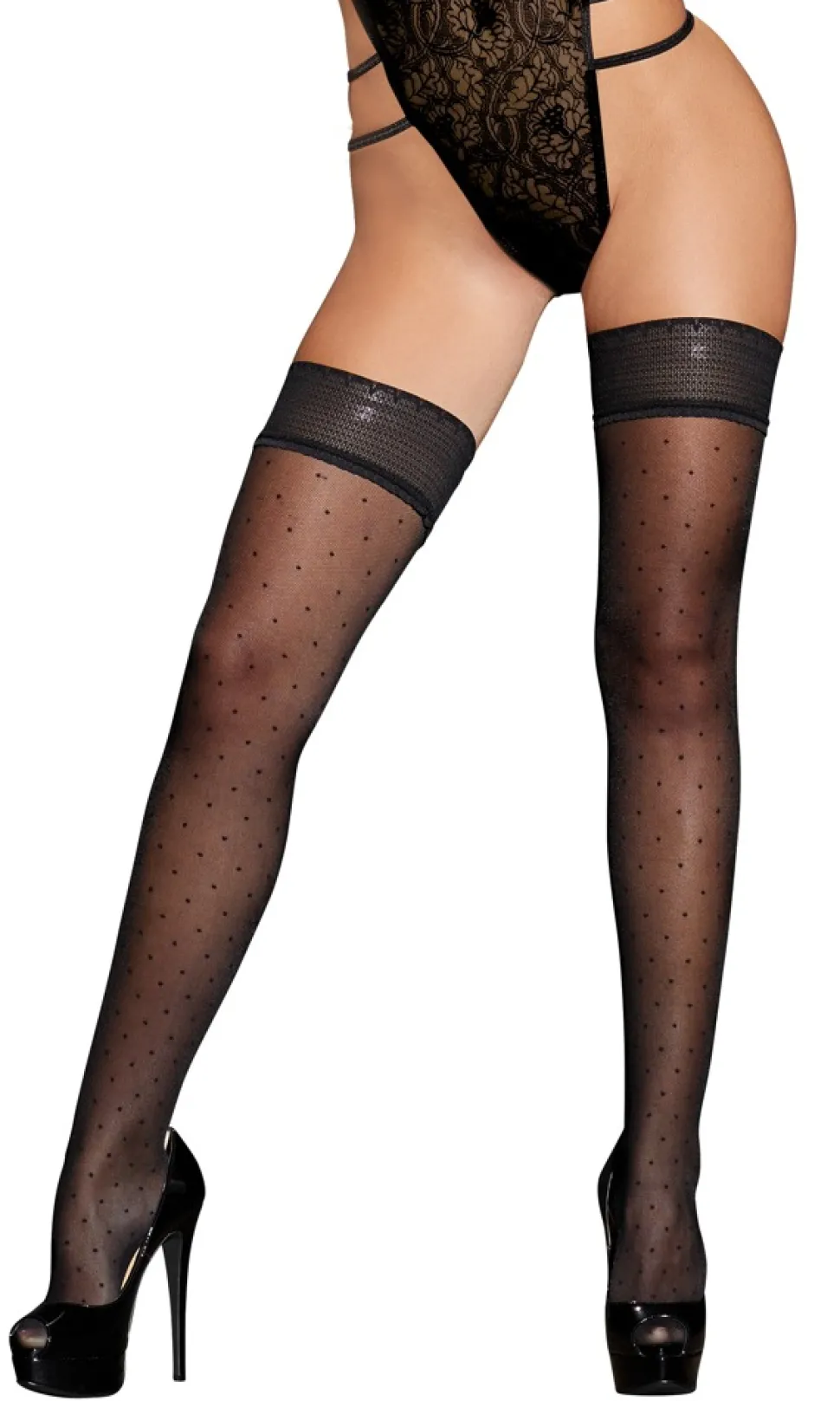 Die halterlosen Strümpfe mit breitem Abschluss bezaubern mit verspielt eingewebten Pünktchen. Ein innen liegendes Silikonband sorgt für einen sicheren Sitz. Verstärkter Zehenpart. Oeko-Tex zertifiziert. 25 den.