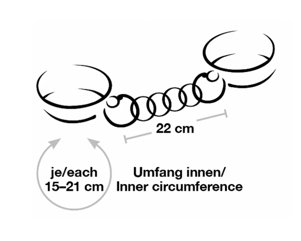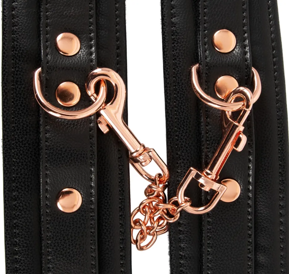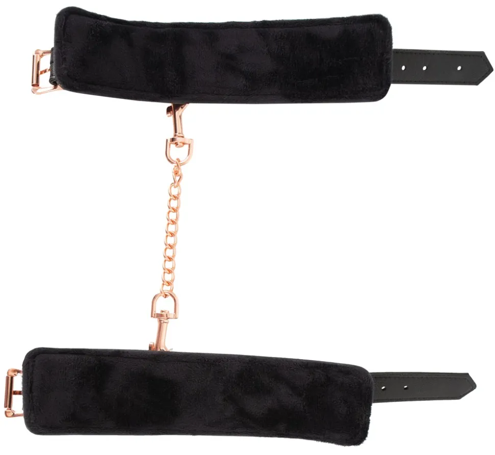 Stabile, hochwertige Handfessel von Bad Kitty in stilvoller Leder-Optik mit Verbindungskette und Metall-Elementen im roségoldfarbenen Glanz. Manschetten innen mit weichem Plüsch gefüttert und jeweils mit Ring zum Einhängen der beiliegenden Karabiner-Verbindungskette. Jeweils mit Schnallenverschluss im Umfang von 15 cm bis 21 cm verstellbar. Verbindungskette mit 2 Karabinern 22 cm lang.