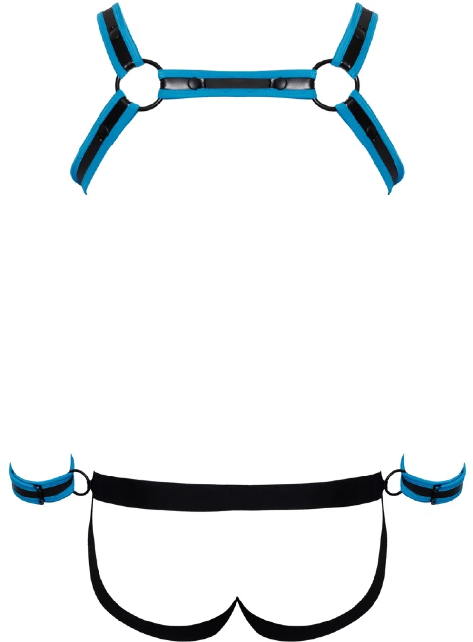 Brustharness, Jock und 2 Handfesseln im Set von Svenjoyment BONDAGE. Extravagante Neopren-Optik in Schwarz mit royalblauen Kontrasten. Harness mit Druckknöpfen schnell an- und abgelegt. Pofreier Jock mit unterlegtem Reißverschluss im Beutel. Am Bund jeweils seitlich ein Ring für die beiliegenden Handfesseln mit verstellbaren Klettverschlüssen.