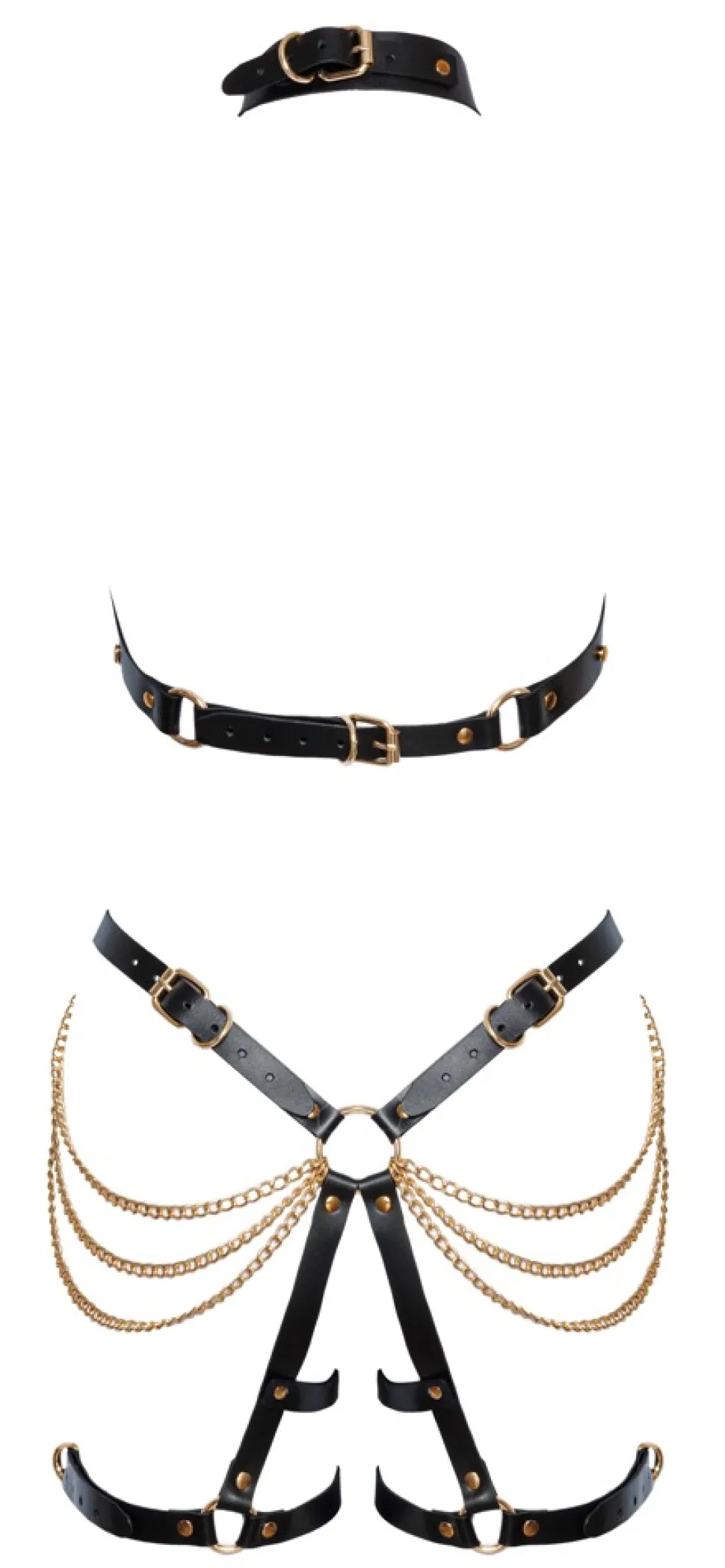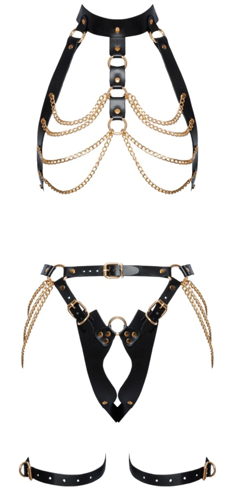 2-teiliges Harness-Set von ZADO mit Neckholder-Top und Jock mit Schenkelriemen. Beide Teile aus schwarzen Lederriemen mit goldschillernden opulenten Ketten und dekorativen Nieten, Ringen und Schnallen. Vielfach verstellbar für perfekte Passform. Are you ready to be DIVA!