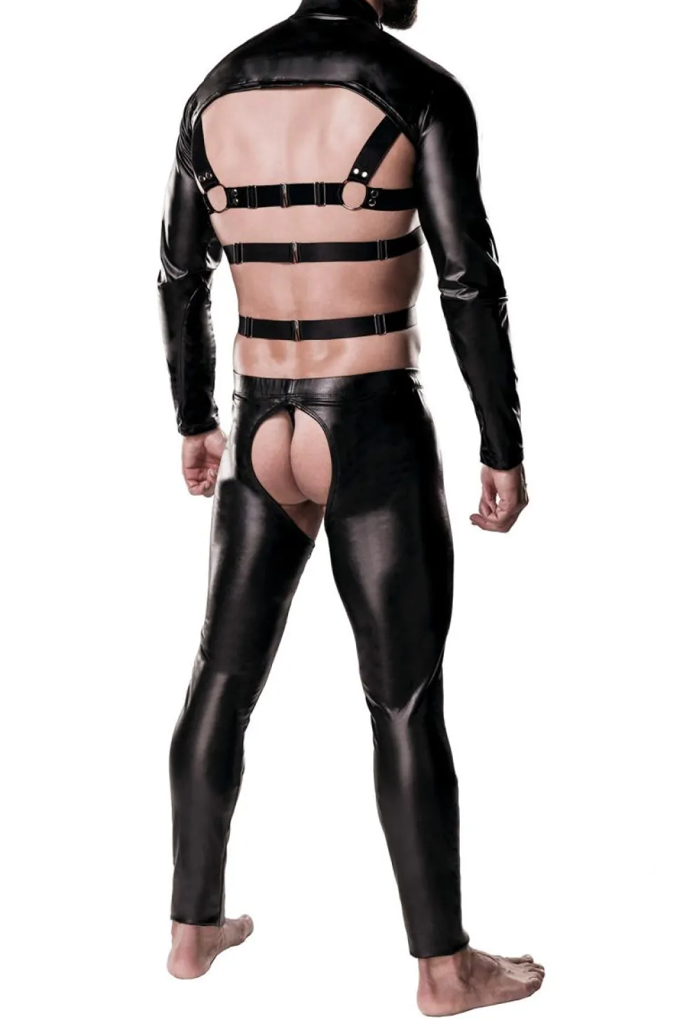Dieses mehrteilige Clubwear-Set für den Herren, besticht durch sexy Design und raffinierten Details. Der Bolero ist aus hochwertigem Lederimitat. Das verbundene Harness-Oberteil, ist mit weichen Gummibändern verziert und lässt sich hinten verstellen. Die Chaps sind eng geschnitten und geben somit eine Körperbetonende Silhouette. Durch den Gummibund, halten sie auch gut. Der passende String ist mit dabei.