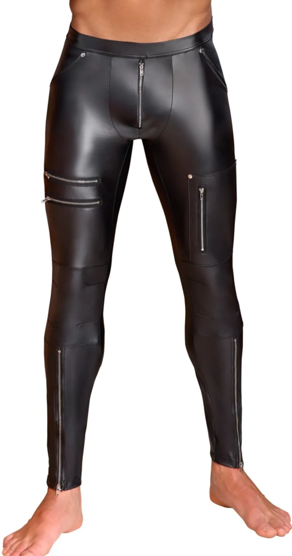 Schmale Hose von NEK im schwarzen Mattlook mit silberfarbenen Zip- und Nieten-Details. Mit bezogenem Stretchbund und rundum weich & elastisch für hohen Tragekomfort. Vorne unterlegter Reißverschluss und 2 Eingriffstaschen. Aufgesetzte Schenkeltasche mit Reißverschluss sowie dekorative Reißverschlüsse zum Öffnen am Oberschenkel und unten an den Beinen. Falten im Kniebereich für viel Bewegungsfreiheit. Hinten 2 aufgesetzte Gesäßtaschen.