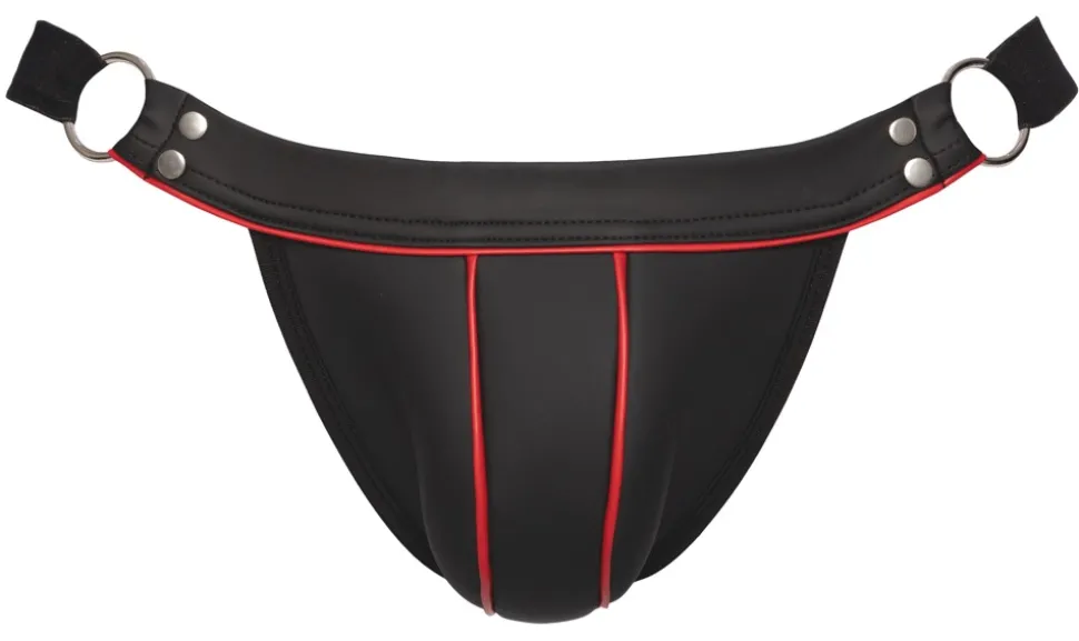 Aufregend po-freier Jockstring von Svenjoyment im trendigen schwarzen Mattlook, der optisch an Neopren erinnert. In der Front mit Biesen in Kontrastfarbe Rot als Eyecatcher. Schön weich und elastisch mit breiten Webriemen für perfekte bequeme Passform.