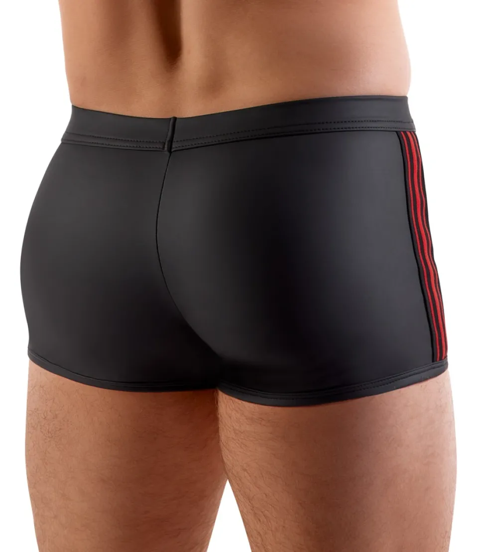 Enge betonende Pants von Svenjoyment im schwarzen Mattlook mit roten Webgummi-Seitenstreifen. Rundum weich und elastisch für maximalen Tragekomfort. Mit Showmaster-Öffnung für den Penis und Swellfunktion. Metall-Penisring (Innen-Ø 5 cm) an Stretchbändern mit Druckknöpfen austauschbar. In den Ring kann für Strap-on-Spiele auch jeder leichte Dildo/Vibrator (nicht beiliegend) mit Saugfuß eingesetzt werden.