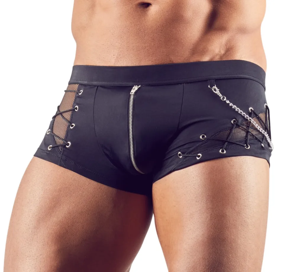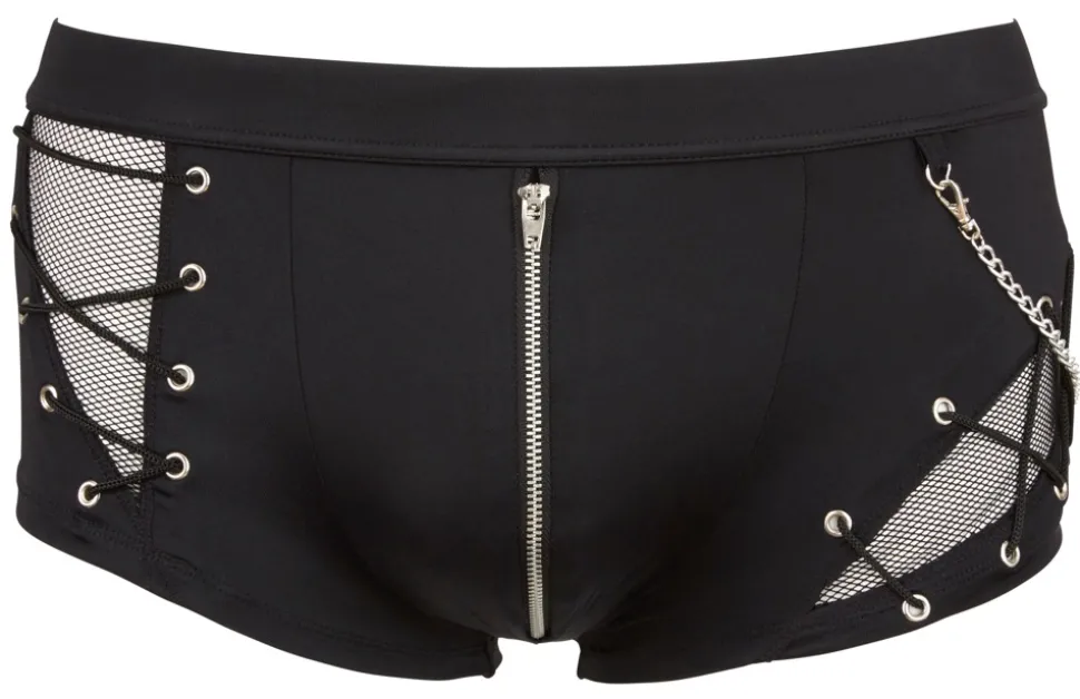 Pants im gekonnten Materialmix aus blickdicht und transparent (Fischnetz) mit abnehmbarer Zierkette und Reißverschluss vorne. Schwarz. Hochelastisch.
