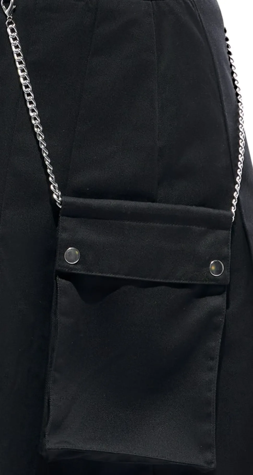 Schwarzer, knielanger Rock von Svenjoyment mit abnehmbarer Tasche. Der feste Webstoff des Rockes liegt oben eng an und springt dann in vielen Falten auf. Bund mit Druckknopfverschluss und unterlegtem Reißverschluss. Die Klappentasche ist mit Ihren Karabinerketten abnehmbar.