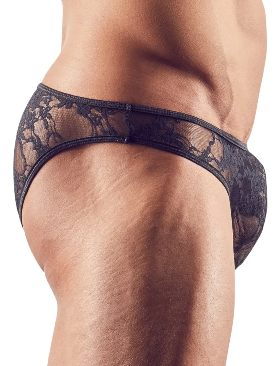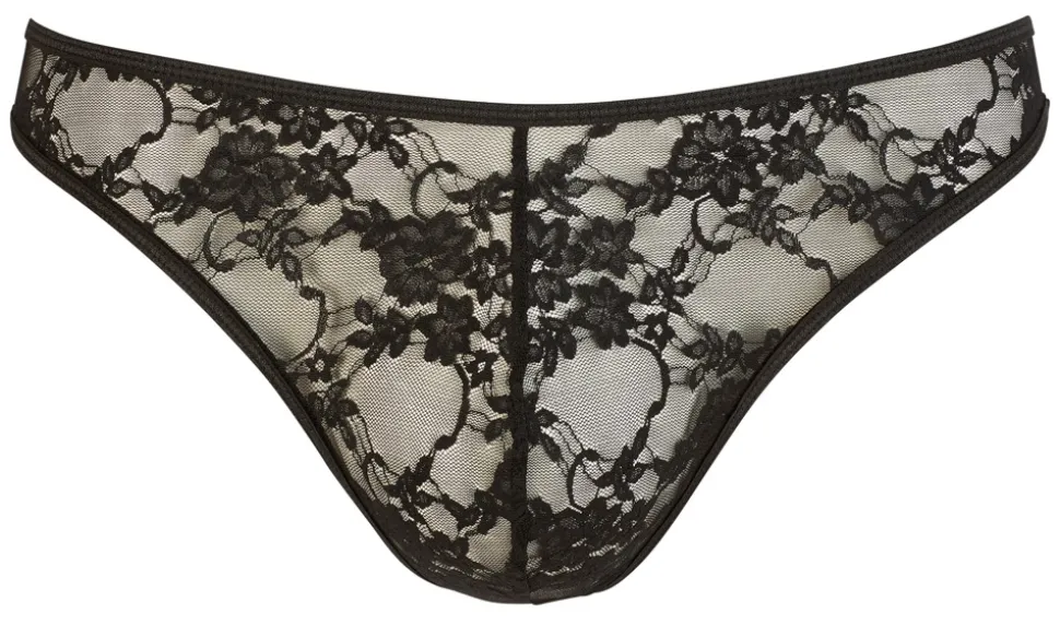 Der schwarze Slip aus elastischer Spitze sorgt für die perfekte Passform. Säume schmal eingefasst.