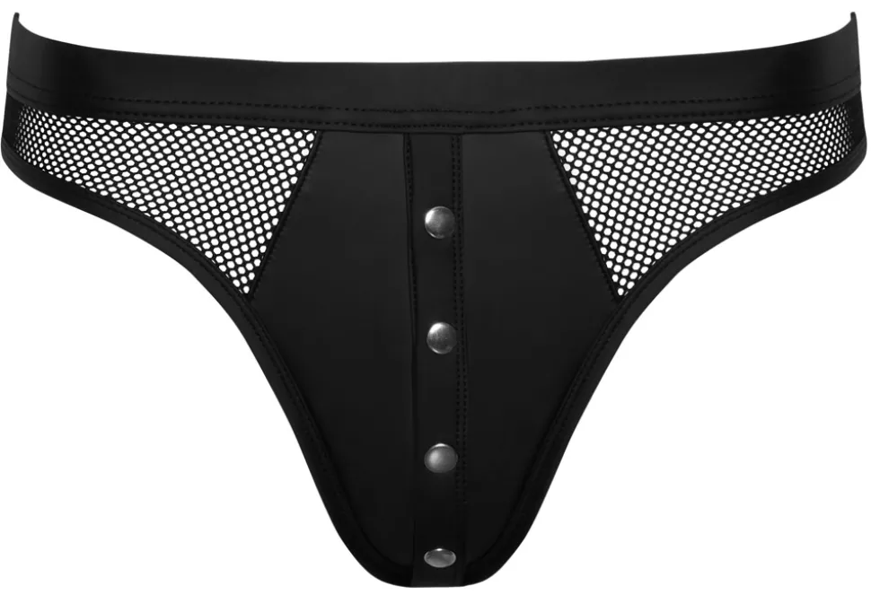 Schwarzer knackiger Riostring von Svenjoyment mit bezogenem Bundgummi. Im elastischen Material-Mix mit hohem Tragekomfort: Mattlook und grobmaschiges Netz. Mit Druckknopfleiste im Beutel zum Öffnen.