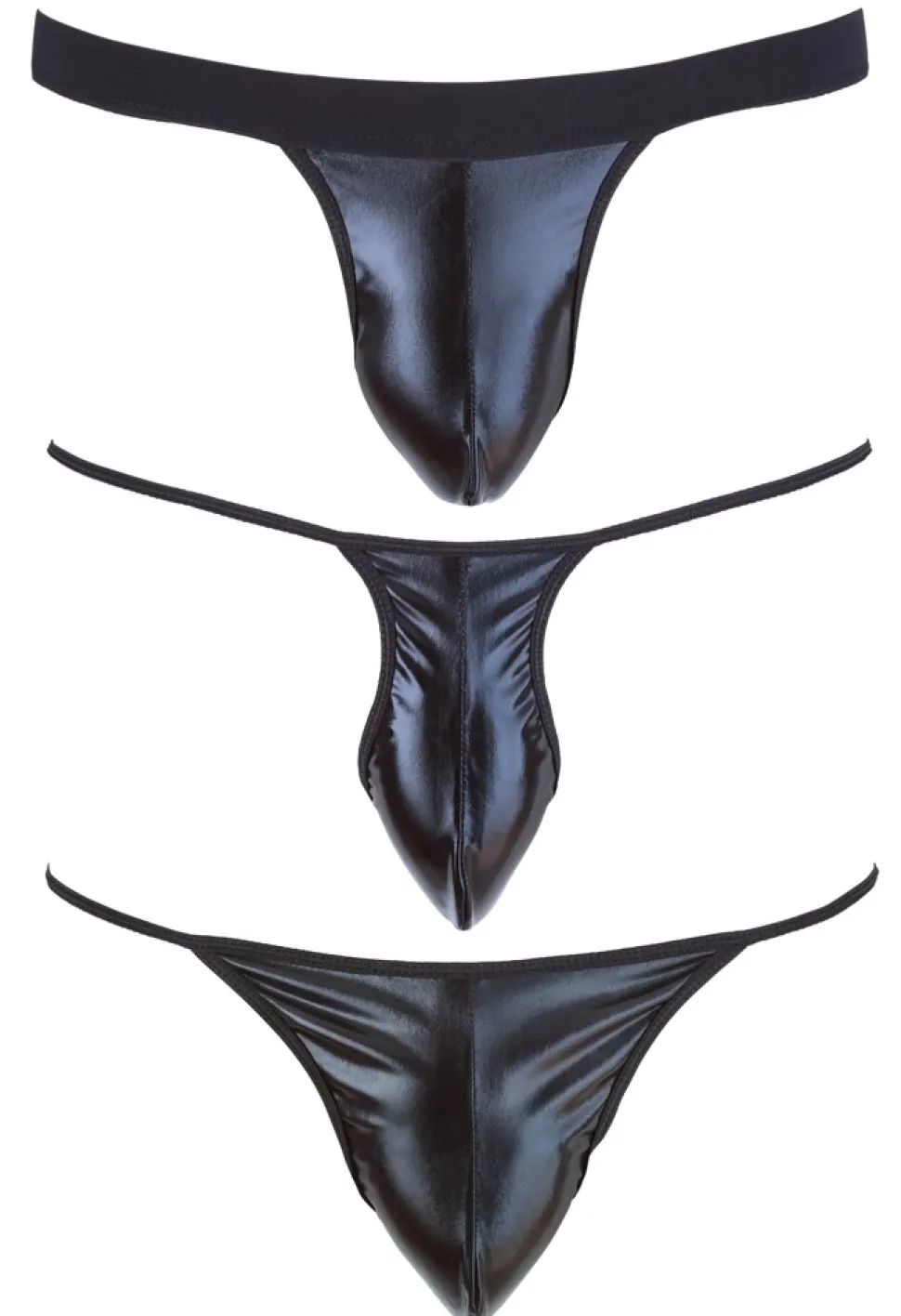 Diese drei Strings kann Mann immer gut gebrauchen: Ministring, Schmalissimo und Jockstring. Alle drei im schwarzen elastischen Wetlook mit starkem Glanz.
