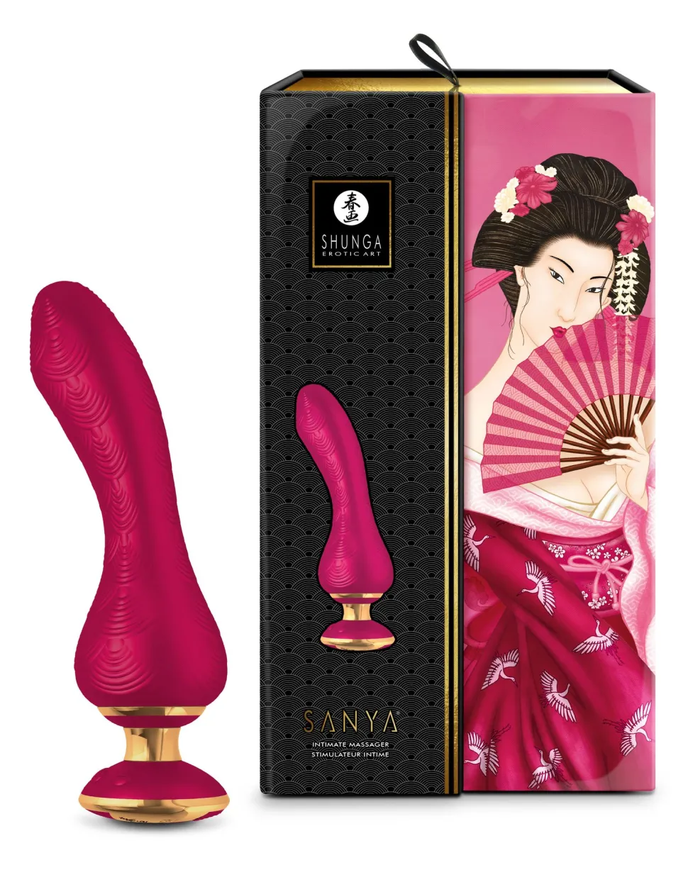 „Für die Frau, die ein Höchstmaß an Raffinesse wünscht, bietet SANYA™Zartheit, Komfort und Flexibilität. Sein luxuriöses und ergonomisches Design, abgestimmt auf seine Leistung, wird alle Ihre Wünsche erfüllen. Die Feinfühligkeit seiner Vibrationen wird Sie mit aufregenden Empfindungen bescheren. Diese werden Sie zum Höhepunkt des vaginalen oder klitoralen Orgasmus bringen. Nervenkitzel mit Stil ist garantiert!“