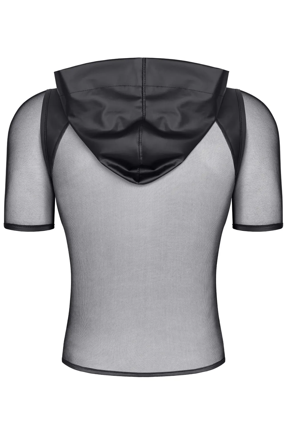 Dieses T-Shirt ist aus weichem, dehnbarem, schwarzem Mesh gefertigt. Einsätze in Wet-Look-Optik an Schultern und Brust sorgen für einen markanten Kontrast und verleihen dem Oberteil einen einzigartigen Charakter. Das transparente Material setzt Ihre Figur, Tattoos oder Piercings gekonnt in Szene. Die weite Kapuze in Wet-Look-Optik verleiht dem Shirt einen zusätzlichen Hingucker.